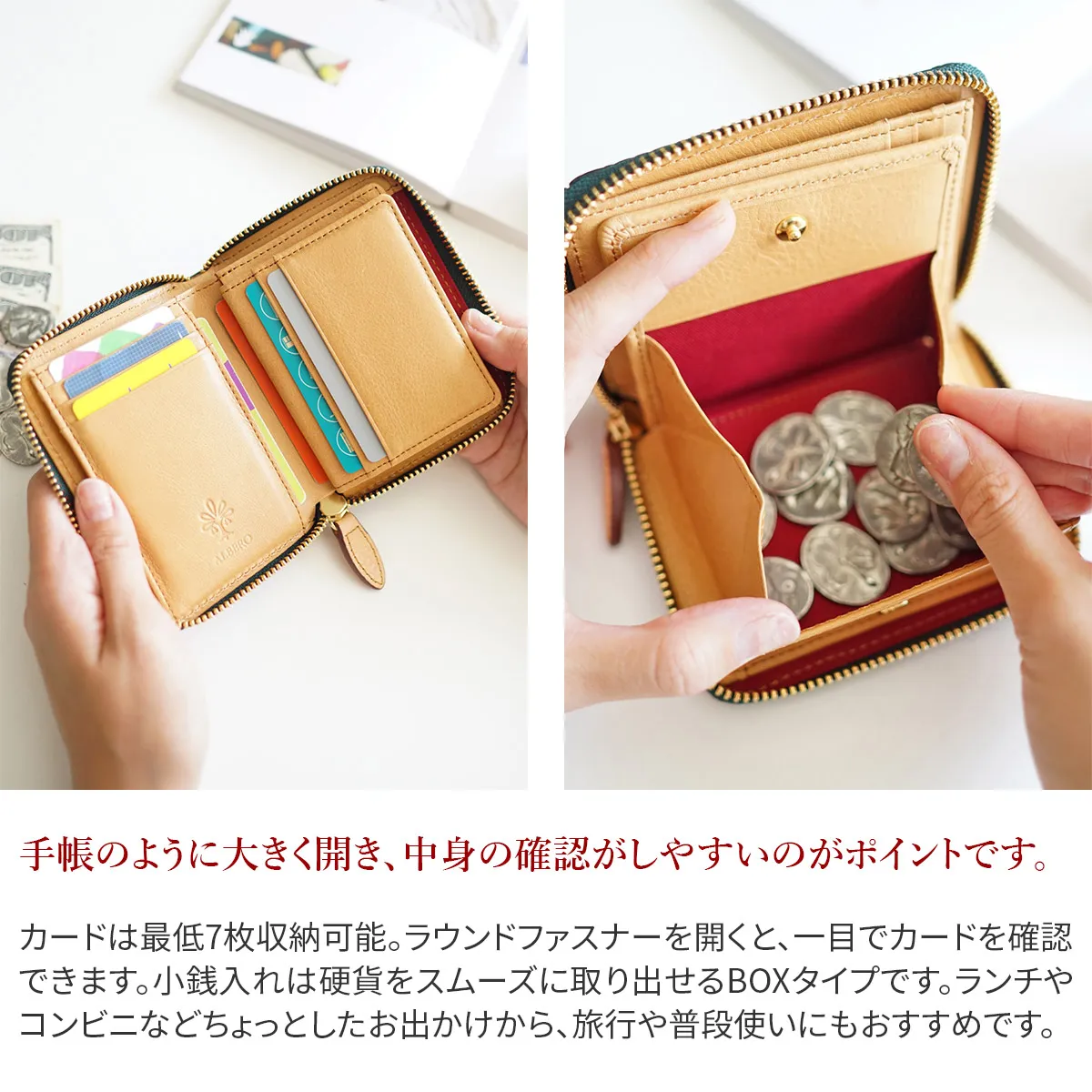 ALBERO(アルベロ) Maglietto(マリエット) 小銭入れ付き二つ折り財布(ラウンドファスナー式) 7002 使いやすい◎カードや紙幣、硬貨が取り出しスムーズ 男女問わずお使いいただけます