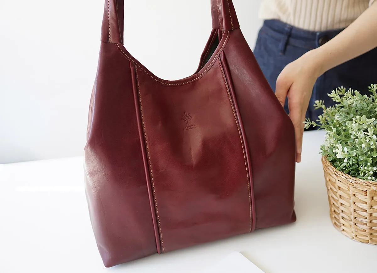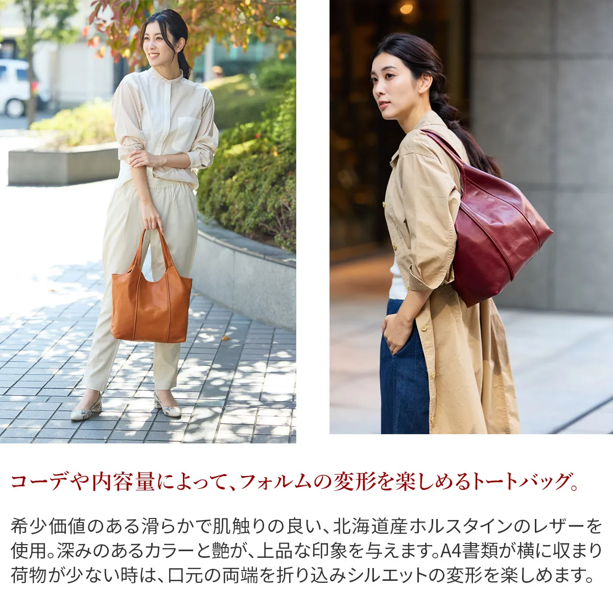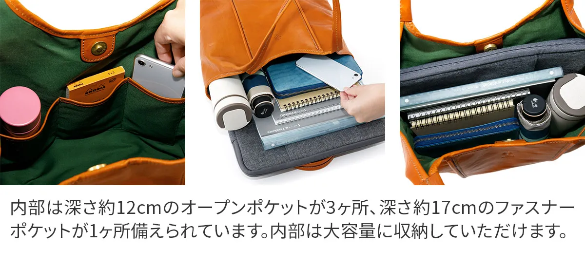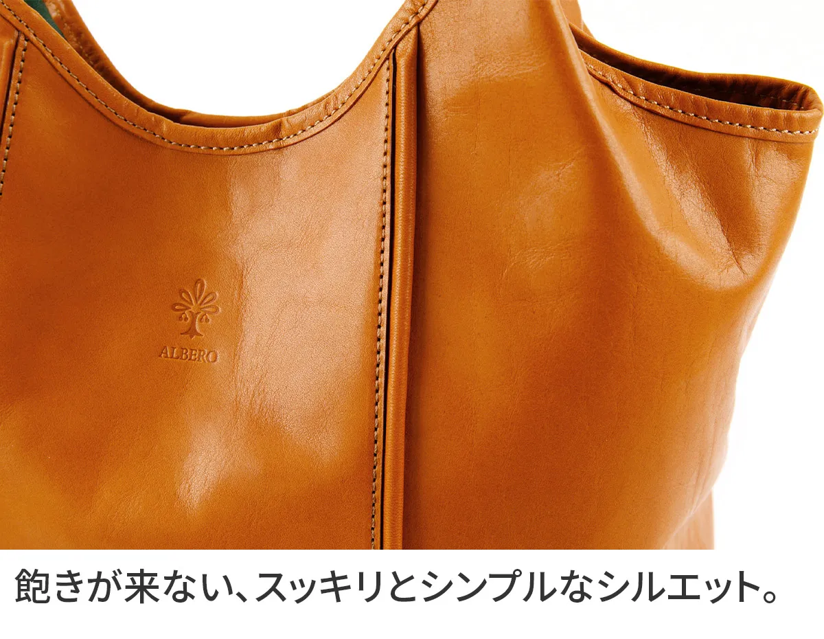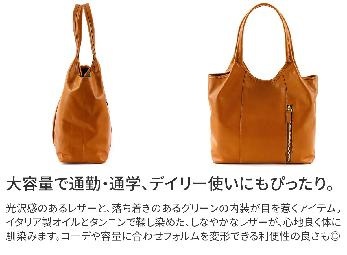 レザーも縫製も誇りの”Made in TOKYO”国内最高級の希少な原皮北海道産雄のホルスタインをイタリア製オイルとタンニンで鞣し染めたしなやかなレザー光沢ある自然な艶と驚く程の軽さが魅力。ふっくらした丸みのあるフォルム。ちょっぴりはみ出したクリーム。 ころんとしたかわいいフォルムが印象的なトートバッグです。美しい光沢感の牛革と内装の上品なグリーンのコントラストが目を惹きます。持ち手立ち上がりが24cmと余裕があり肩がけしやすい設計。A4書類が横向きで収まるサイズ感で、通勤通学にはもちろんプライベートでも活躍してくれるアイテムです。荷物が少ない時は口元の両端を折り込むことで、印象が異なるシルエットをお楽しみいただけます。