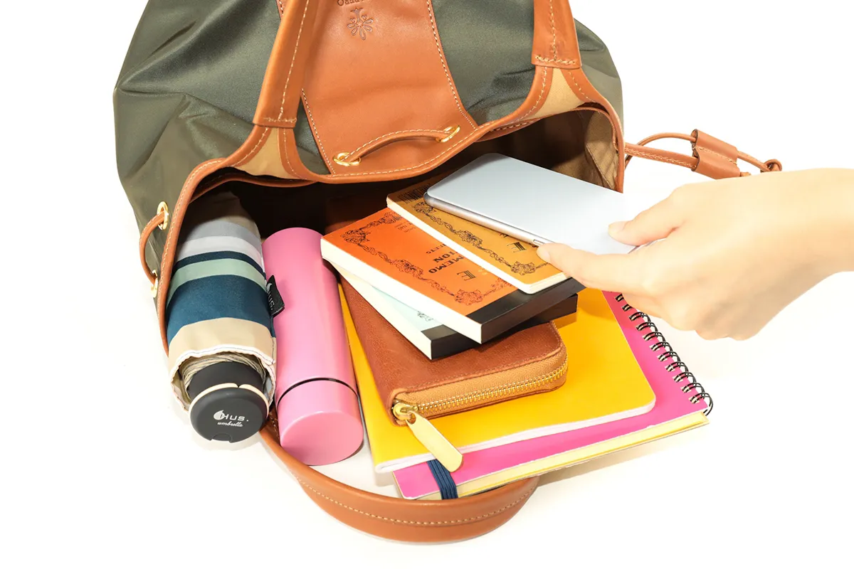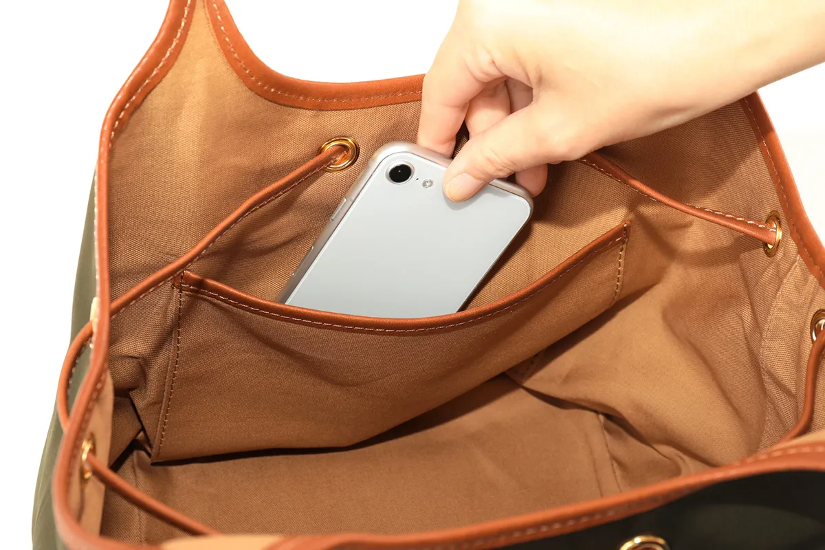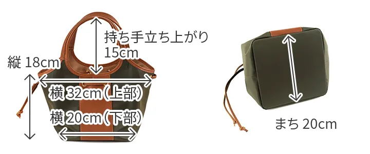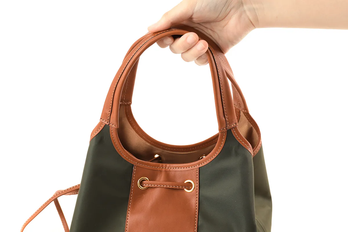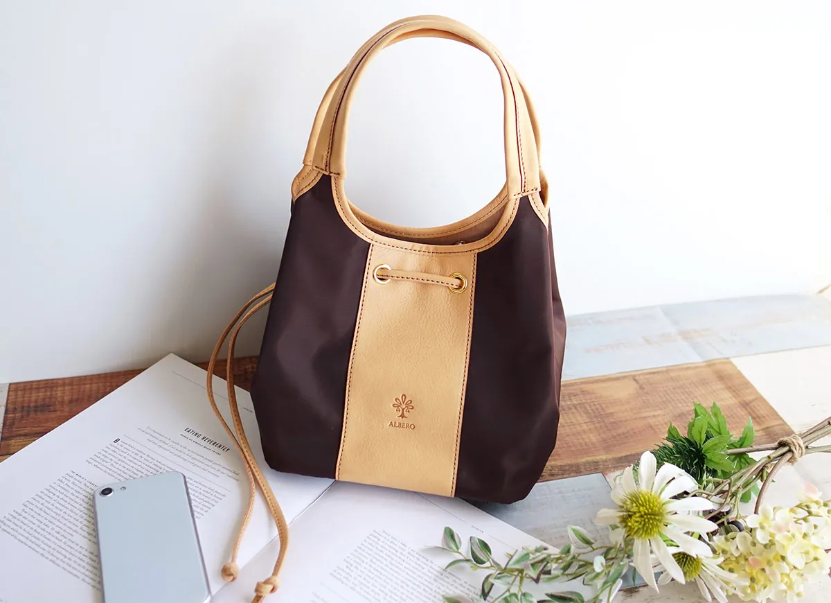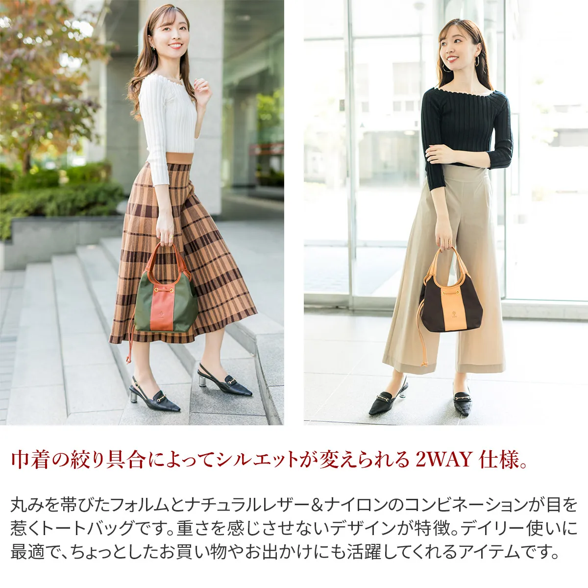 経年変化を楽しめるナチュラルシボとアプリコットブラウンのレザーをセンターにアクセントを付けた、光沢感のあるナイロンのコンビネーションシリーズ。 巾着を絞っていただくと2WAY仕様でご利用いただだけるトートバッグ。 本格的なナチュラルシボの牛革にナイロン素材を取り入れているので、軽量に仕上がっています。マチ幅が広く取られているので、奥行のある収納力で、500mlのペットボトルは横にすればすっぽり入れていただけます。 落ち着いたカラー展開で、年代を問わず挑戦していただけます。