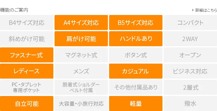 収納力も高く、落ち着きあるデザインなので、通勤や通学から、旅行やアウトドアなどアクティブに動きたい日まで、様々なシーンに対応します。よく使う小物類を収納出来る外ポケットがある便利な作りです。開口部はダブルファスナー式で、開閉しやすくなっています。 素材には、福井県の織元で昔ながらの織り機で丁寧に織り上げたナイロンチュールを使用しています。3日で1反しか織れない繊細で手の込んだ上質な素材です。極細の50デニール糸で芯の部分にポリエステルを入れて強度を増しています。更に織り上げた生地は、新潟の工場でさらにプレス加工を施しています。熱を加えることで独特の張り感が感じられます。また、とても軽く強度があるところが特徴的です。