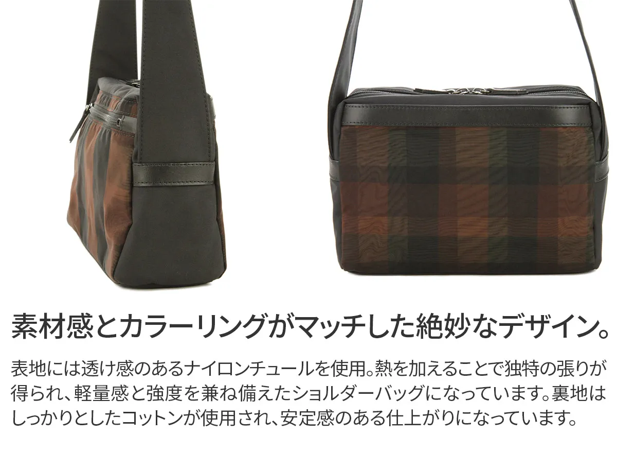 ショルダーベルトはお好みの長さで調節ができ、ベルトの端がパタパタとしないスマートな作りとなっています。チュール素材が見た目にも軽やかな印象を与えてくれます。A5サイズの収納が可能なコンパクトサイズです。まち幅はたっぷりとあるので、見た目以上に荷物を収納でき、お出かけバッグとしても最適です。 素材には、福井県の織元で昔ながらの織り機で丁寧に織り上げたナイロンチュールを使用しています。3日で1反しか織れない繊細で手の込んだ上質な素材です。極細の50デニール糸で芯の部分にポリエステルを入れて強度を増しています。更に織り上げた生地は、新潟の工場でさらにプレス加工を施しています。熱を加えることで独特の張り感が感じられます。また、とても軽く強度があるところが特徴的です。