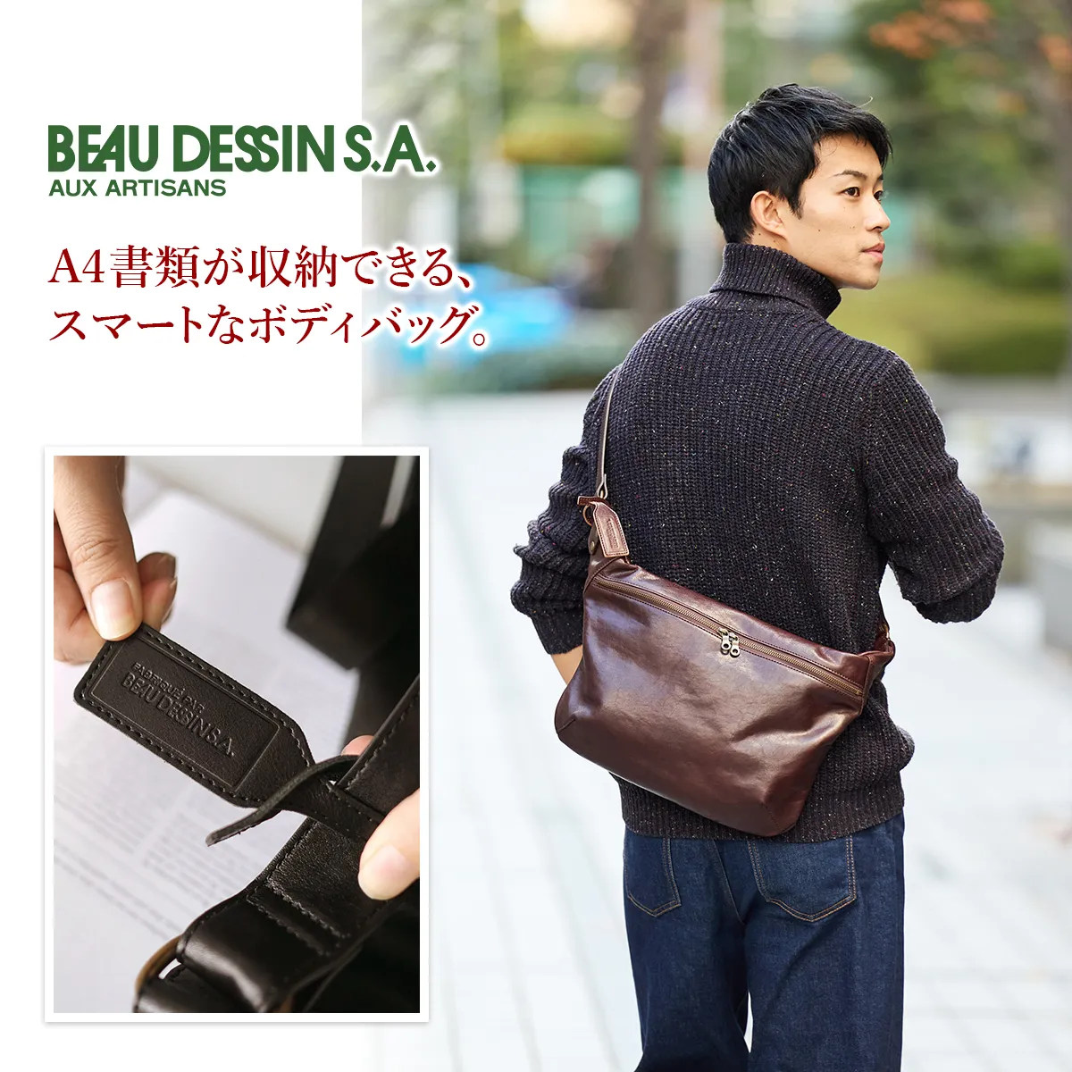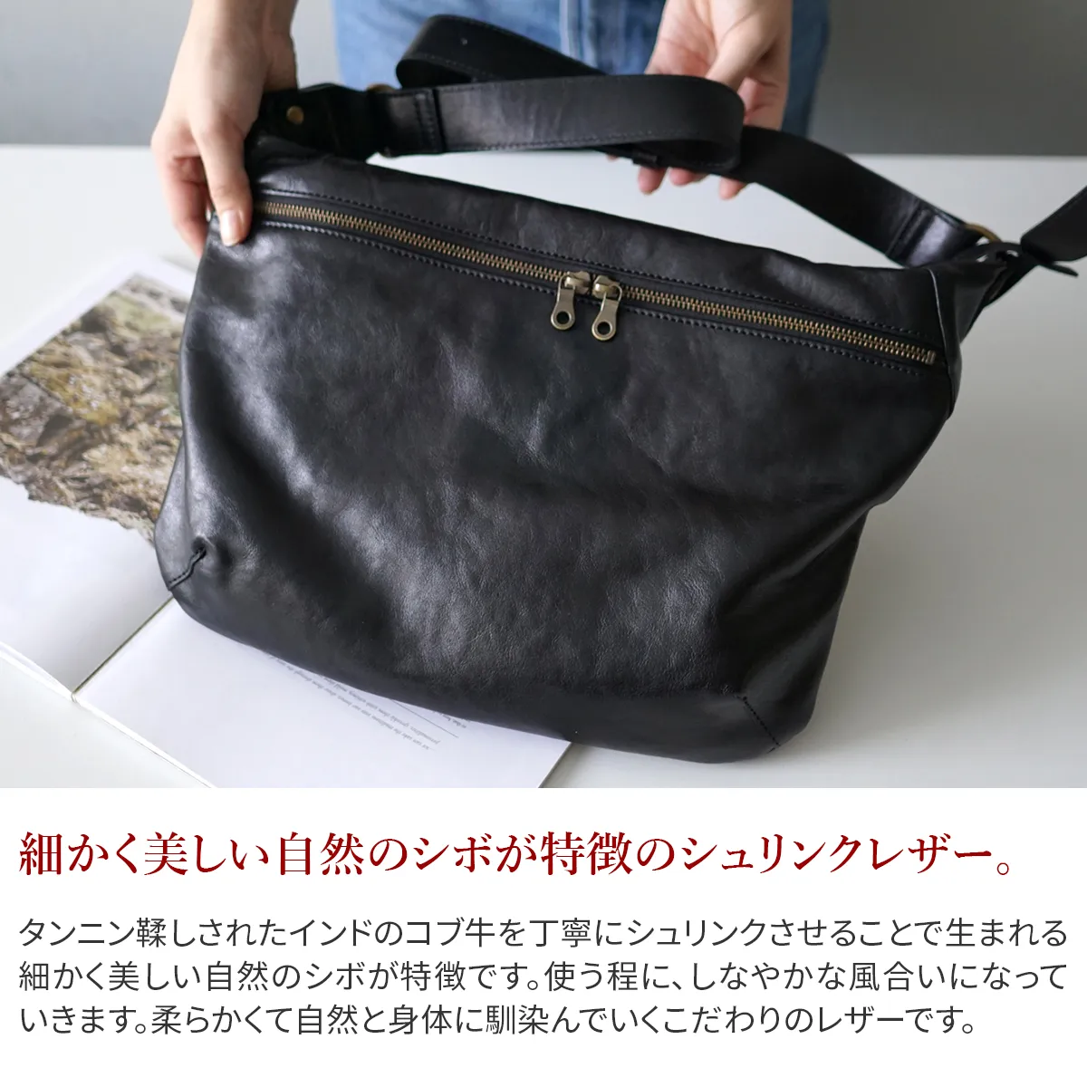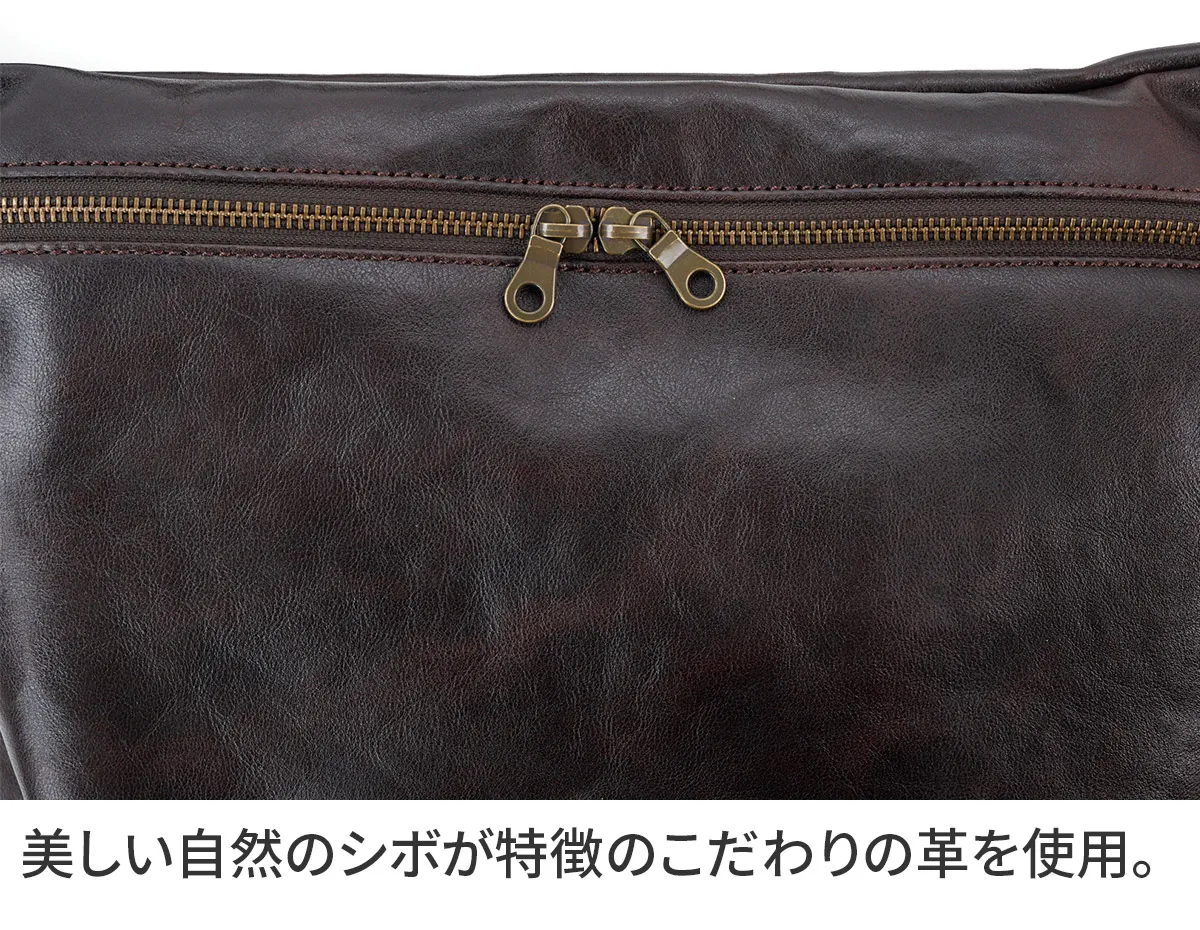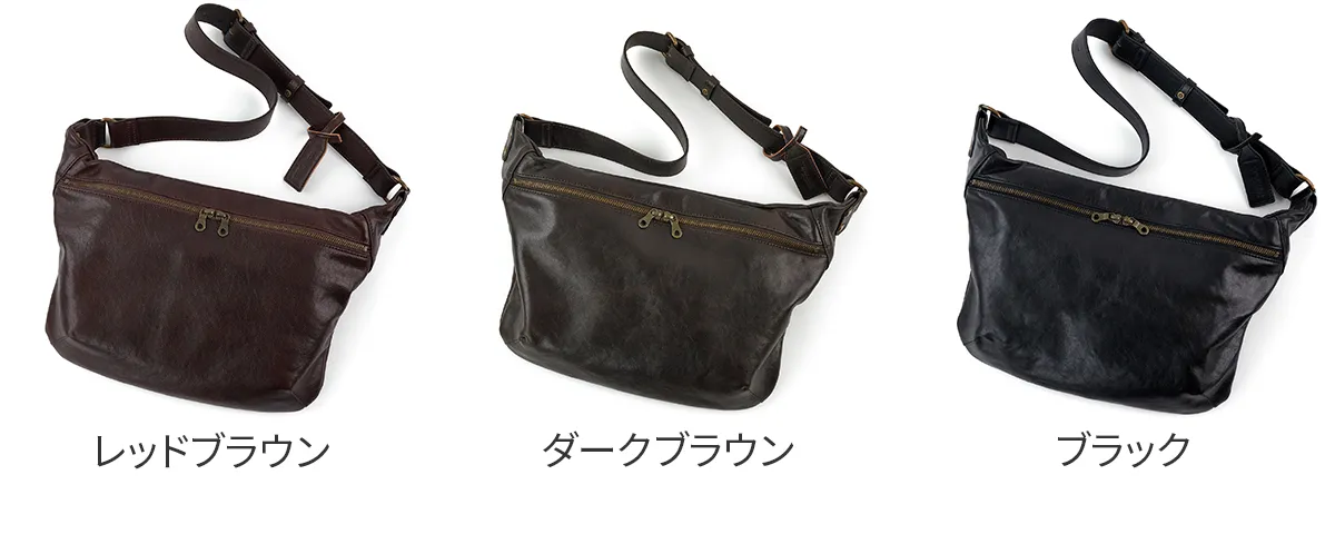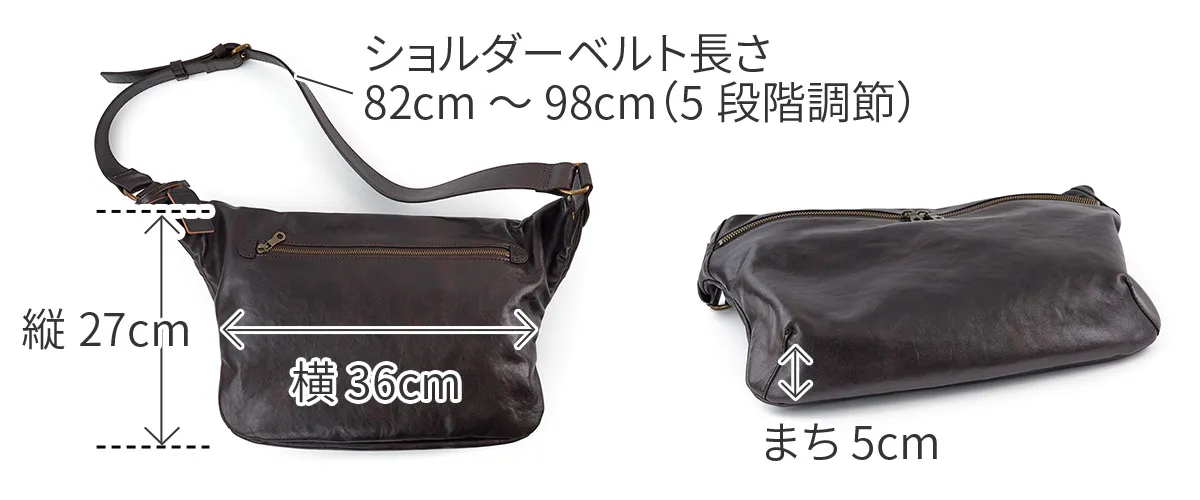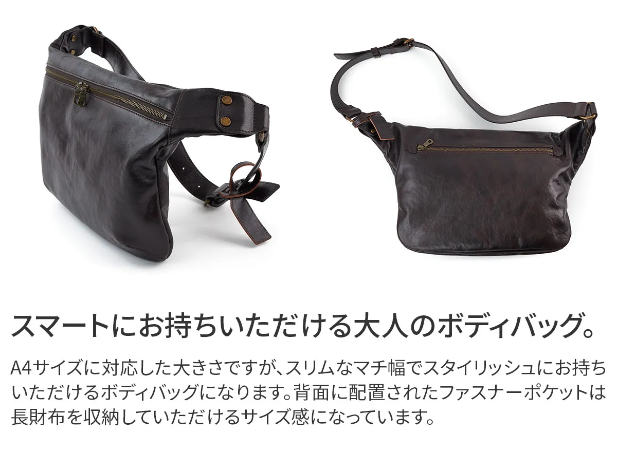 タンニン鞣しされたインドのコブ牛を丁寧にシュリンクさせることで生まれる細かく美しい自然のシボが特徴です。使う程に、しなやかな風合いになっていきます。柔らかくて自然と身体に馴染んでいくこだわりのレザーです。 A4サイズに対応した大きさですが、スリムなマチ幅でスタイリッシュにお持ちいただけるボディバッグになります。背面に配置されたファスナーポケットは、長財布を収納していただけるサイズ感になっています。スマートな印象でありながら存在感もあり、大人カジュアルなコーデと好相性です。上質感漂う革の雰囲気もお楽しみいただけます。