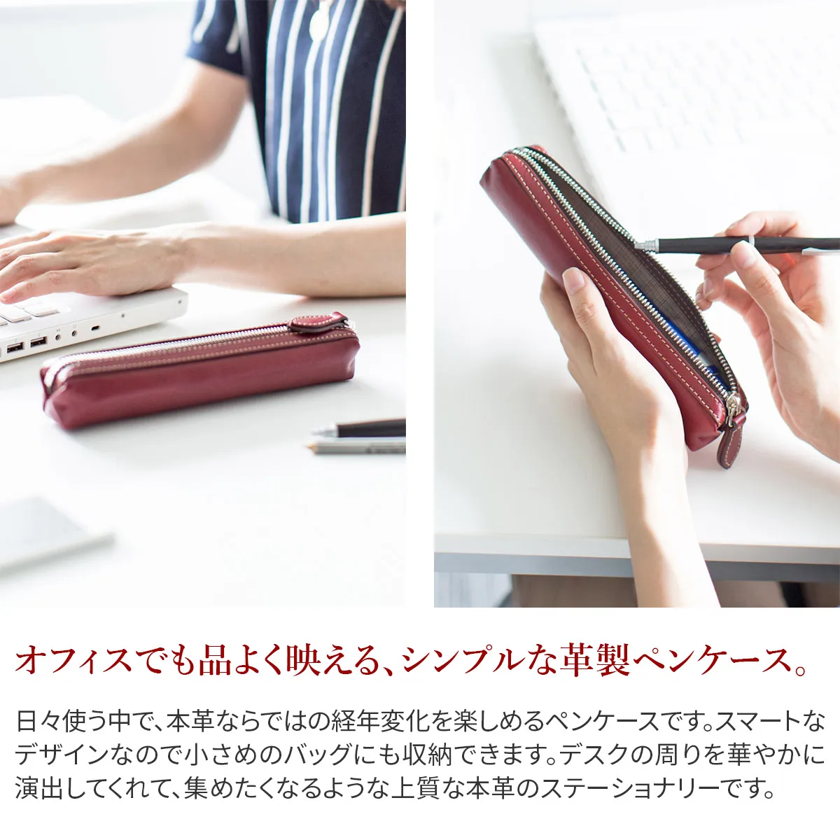 日々使う中で、本革ならではの経年変化を愉しめるペンケースです。スマートなデザインなので小さ目バッグにも収納できます。デスク周りを華やかに演出してくれる、集めたくなる上質な本革のステーショナリーのひとつです。 素材には、厚みのあるヌメ革を丁寧にミーリングすることにより、コシ感とソフト感の両方を合わせ持つ革を使用しています。また、スポンジで叩くように1枚1枚色を塗り重ねていくタンポナートと呼ばれる染色加工は丁寧な手仕事で、ナチュラルな透明感を引き出しています。