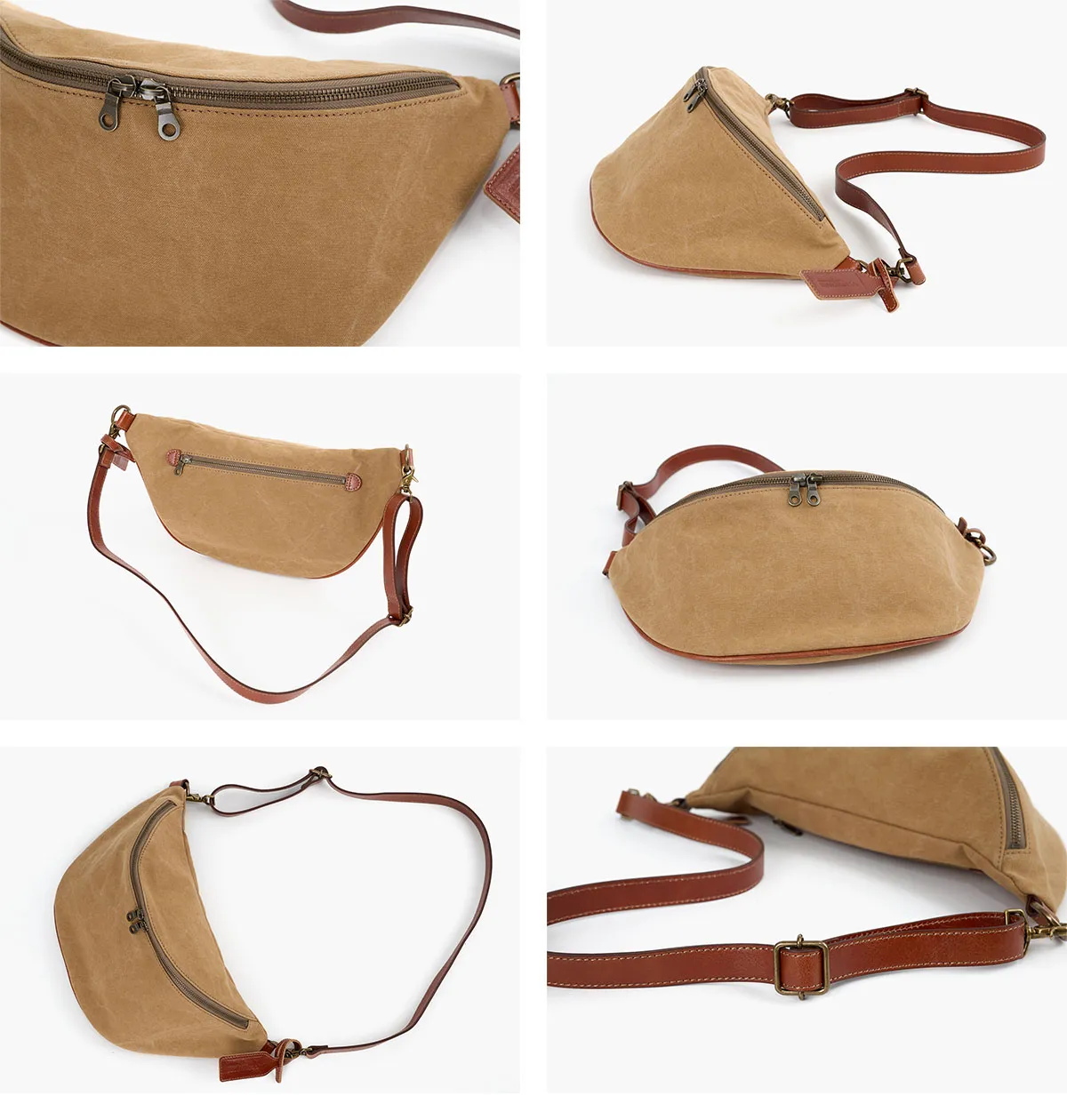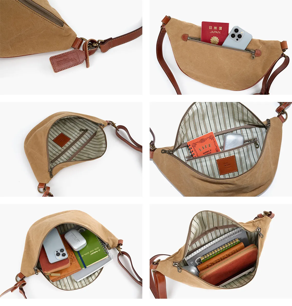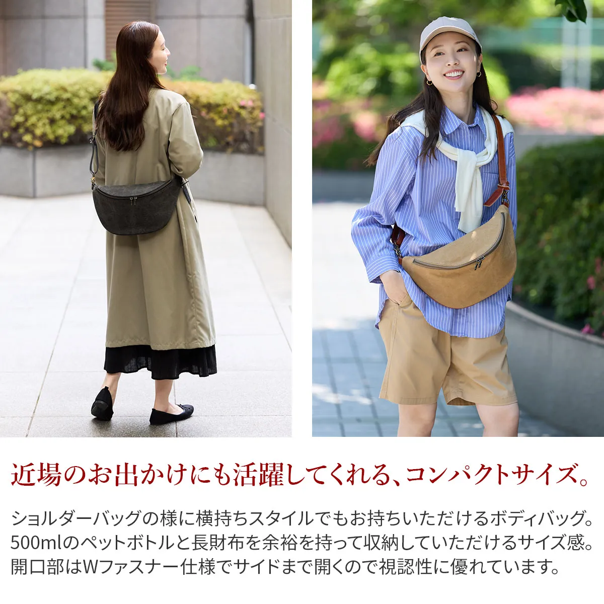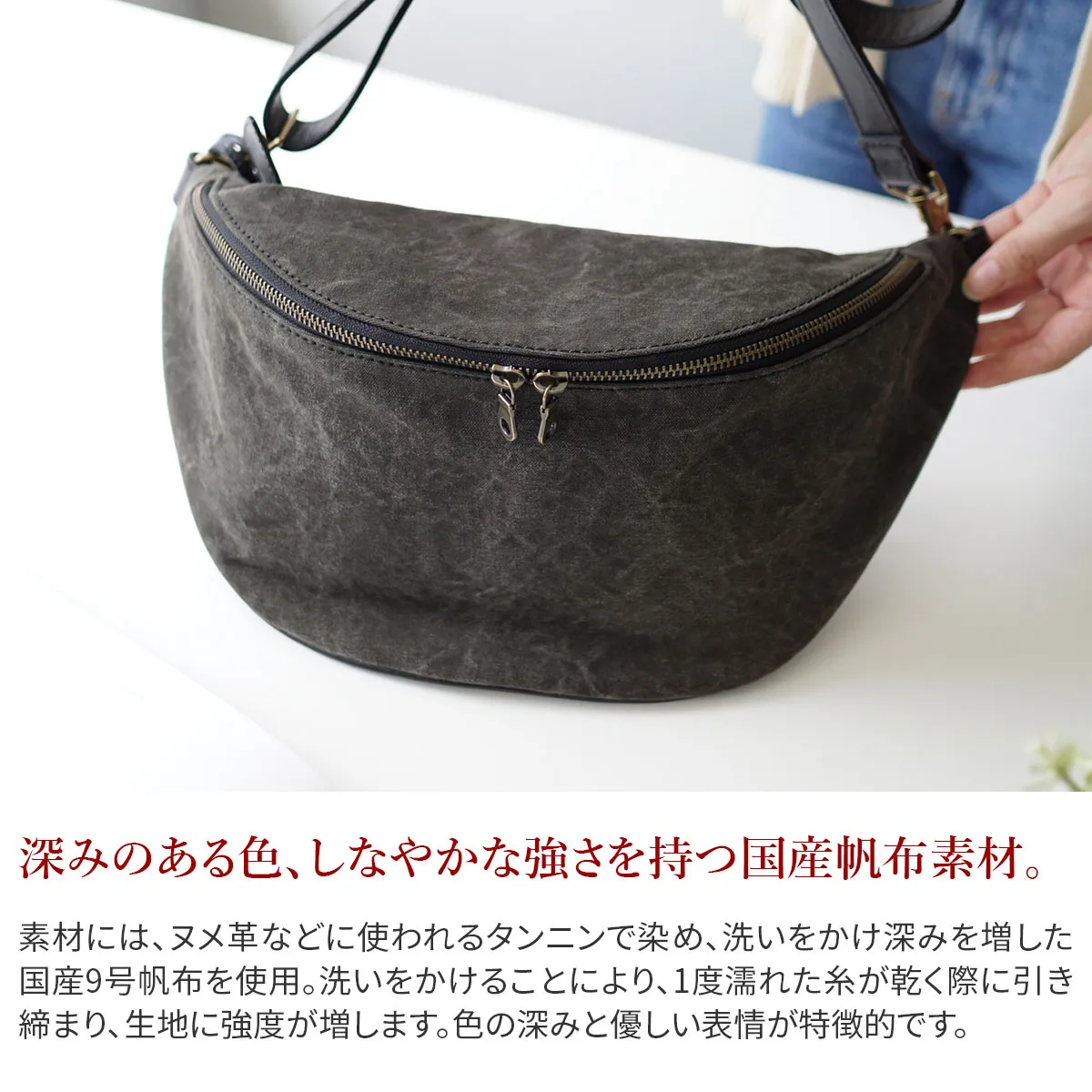 素材には、ヌメ革などに使われるタンニンで染め、洗いをかけ深みを増した国産9号帆布を使用しています。洗いをかける事により1度濡れた糸が乾く際に引き締まり生地に強度が増します。また、洗うことにより色の深みと優しい表情が特徴的な素材です。 ショルダーバッグの様に横持ちスタイルでもお持ちいただけるボディバッグです。500mlのペットボトルと長財布を余裕を持って収納していただけるサイズ感です。本体は綿素材を使用しており、とても軽量な作りです。開口部はWファスナー仕様でサイドまで開くので視認性が良く、荷物の出し入れもスムーズに行えます。