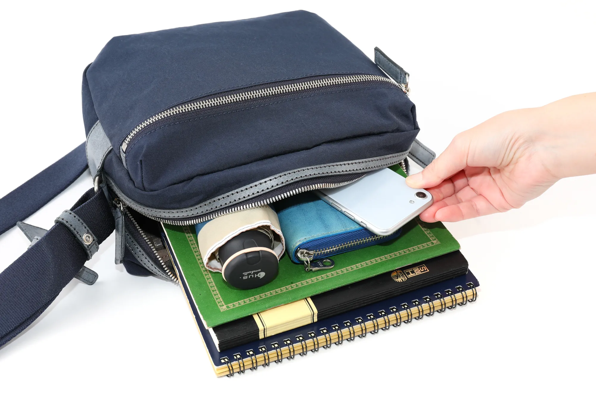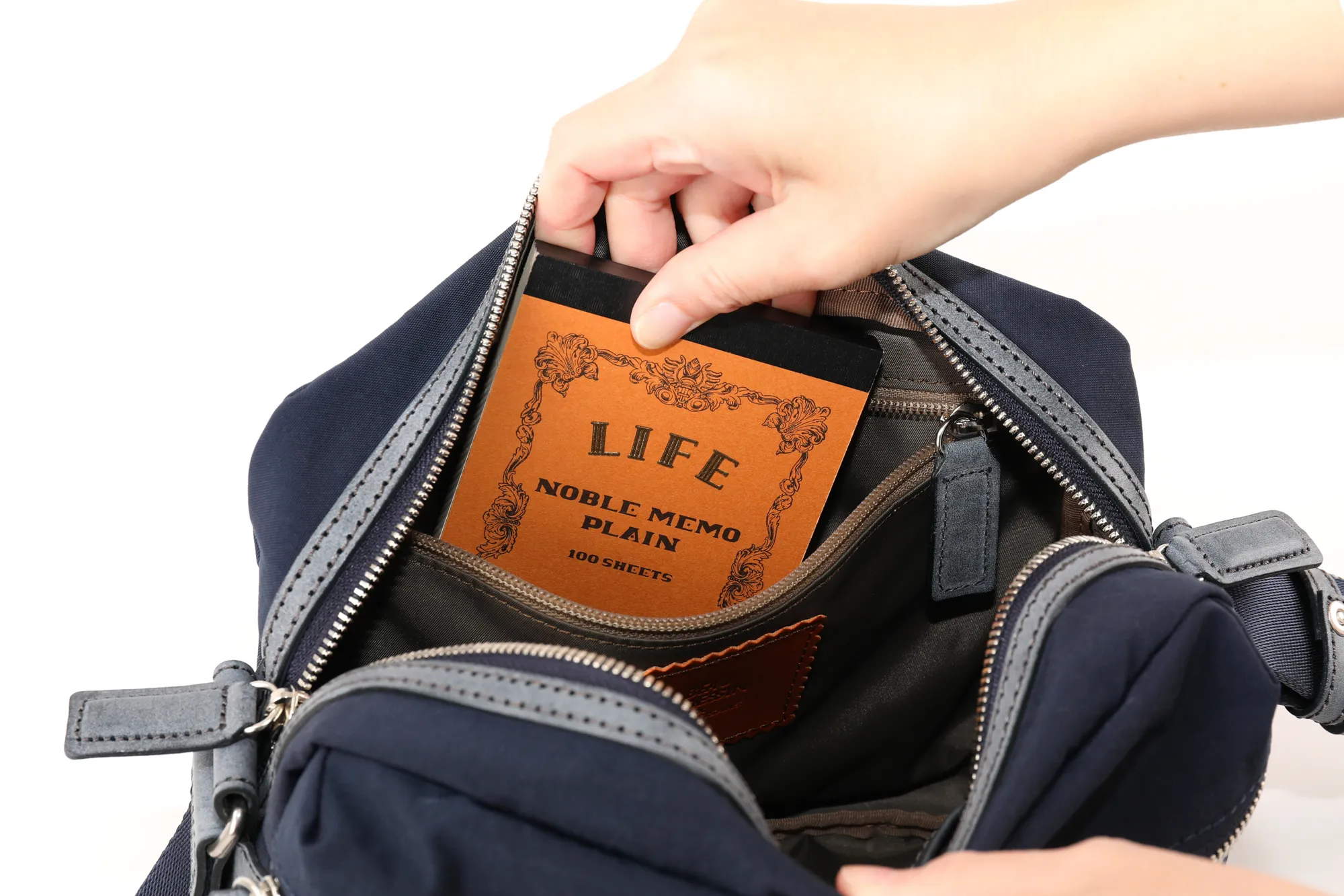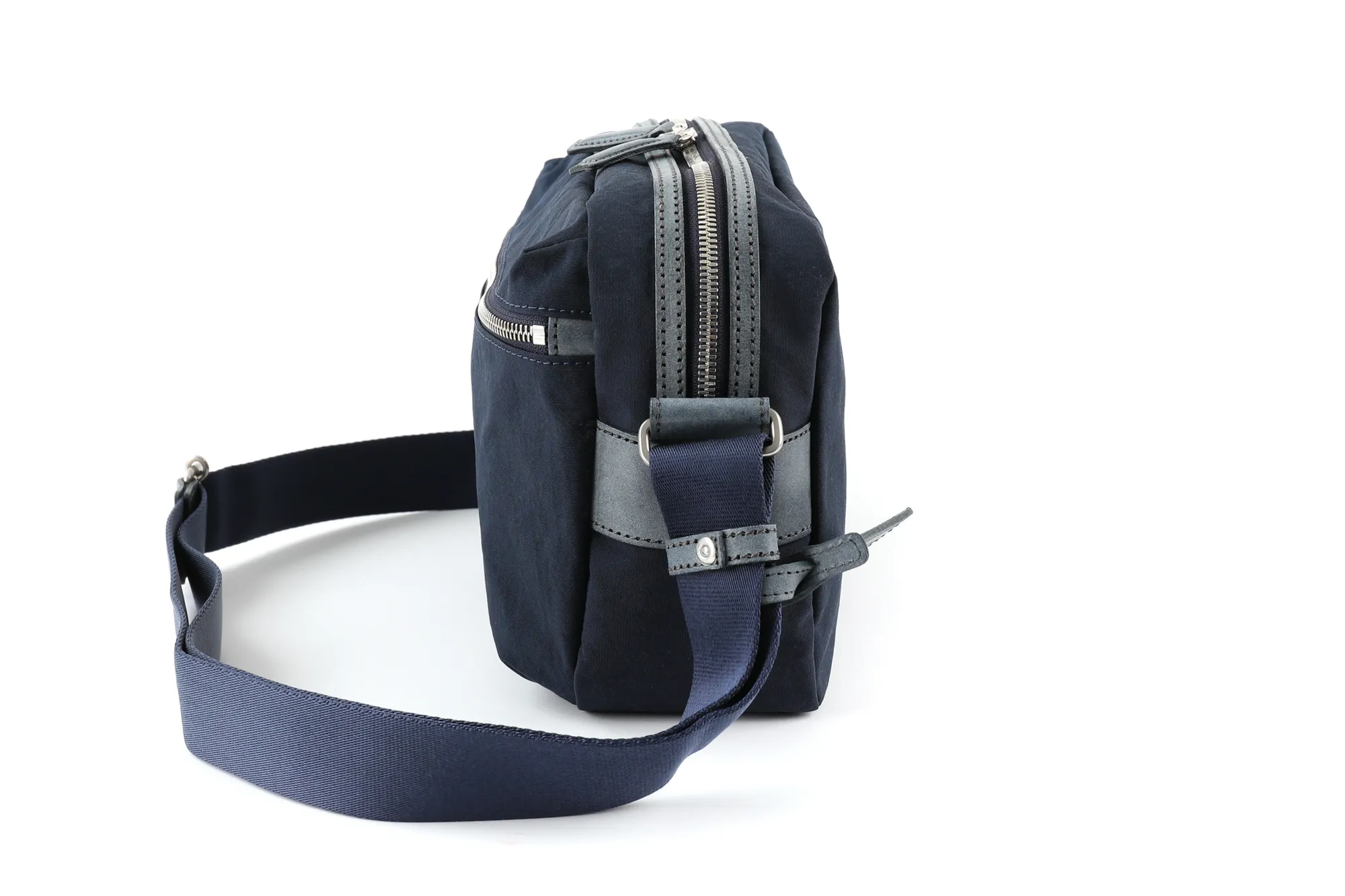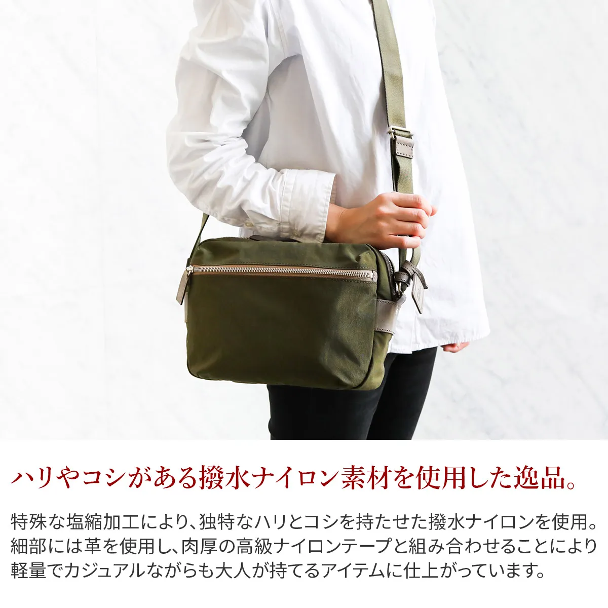 本ナイロン素材は、塩縮加工することで独特のシワ感とコシを出したものです。使用しているナイロンテープも、一般的には堅くなりがちですが、中空構造の糸で織ることで、膨らみがありソフト感のある最高級なものです。特殊な塩縮加工により、独特なハリとコシを持たせた撥水ナイロンです。革付属部分にはロロマシリーズでも使用しているレザーを使い、肉厚の高級ナイロンテープと組み合わせることにより、軽量でカジュアルながらも大人が持てるシリーズです。 ナイロン素材の軽量なショルダーバッグになります。A5サイズに対応した大きさで、小学生ぐらいのお子様から大人の方まで幅広くお持ちいただけます。外ポケットはマチ幅があり、お財布やスマホなど、すぐに取り出したい物を収納するのに活躍してくれます。コンパクトな見た目でありながら、最小限の必需品はしっかりと収納していただける容量となっております。ショルダーベルトを最短の長さに調節していただくと、カジュアルになり過ぎない肩がけスタイルもお楽しみいただけます。