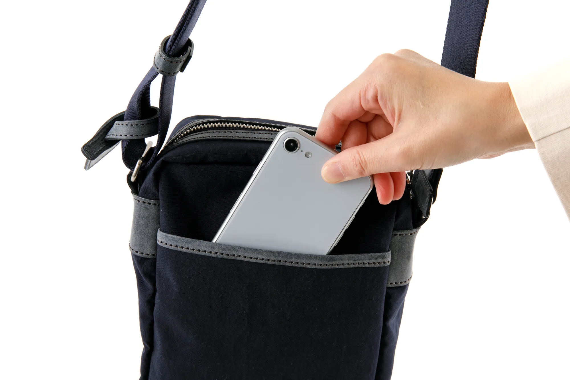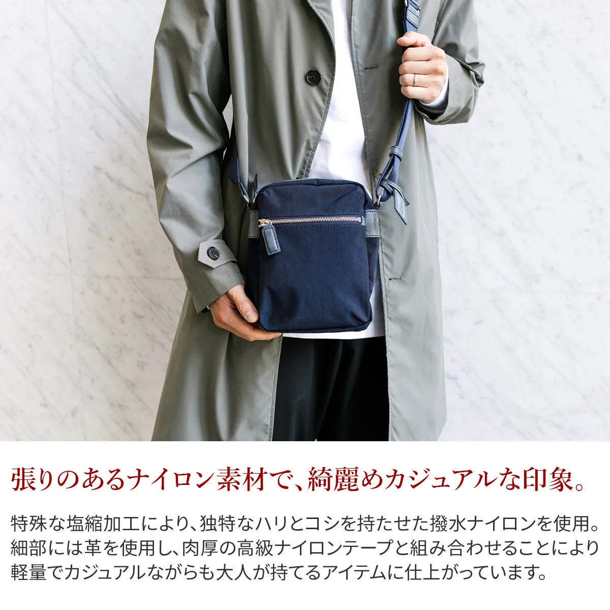 本ナイロン素材は、塩縮加工することで独特のシワ感とコシを出したものです。使用しているナイロンテープも、一般的には堅くなりがちですが、中空構造の糸で織ることで、膨らみがありソフト感のある最高級なものです。 特殊な塩縮加工により、独特なハリとコシを持たせた撥水ナイロンです。 革付属部分にはロロマシリーズでも使用しているレザーを使い、肉厚の高級ナイロンテープと組み合わせることにより、軽量でカジュアルながらも大人が持てるシリーズです。 軽量なナイロン素材のショルダーバッグになります。ちょうどA5サイズぐらいの大きさで、小学生ぐらいのお子様から大人の方まで幅広くお持ちいただけます。外ポケットはマチ幅があり、二つ折り財布やスマホ、パスケース等すぐに取り出したい物を収納するのに活躍してくれます。ショルダーベルトを最短の長さに調節していただくと、カジュアルになり過ぎない肩がけスタイルもお楽しみいただけます。コンパクトな見た目でありながら、最小限の必需品はしっかりと収納していただける容量となっております。