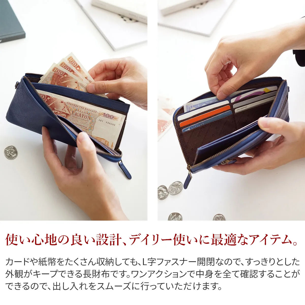 オイルを多く含ませ、程よいハリ感と柔らかな質感が特徴のシリーズ。 しっとりとした風合いで、触り心地も抜群です。 縁の革巻きを通常よりも大きく取ることで、カジュアルな見た目に仕上がっています。 1.5cmと薄マチですが、カード入れが充実していたり通帳も収納することができる、実用性に優れた長財布です。 深みのあるカラーが印象的で、エイジングを楽しみながらお使いいただけます。