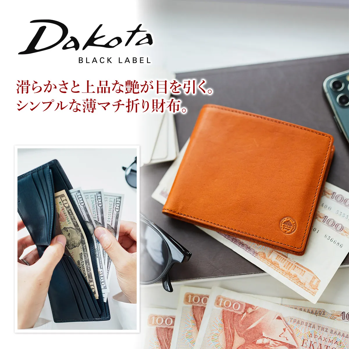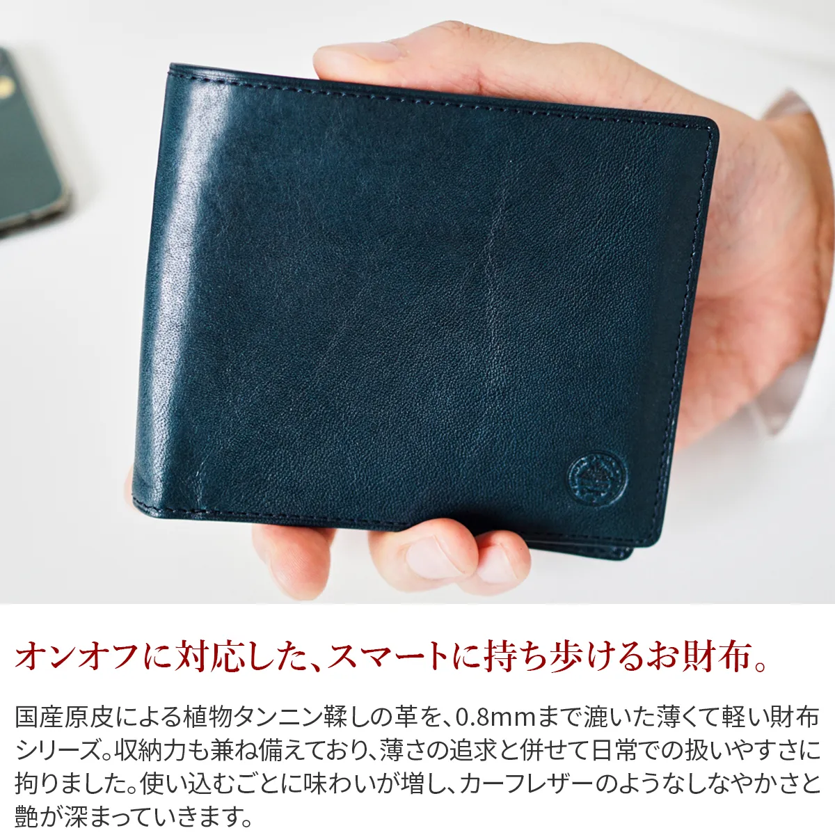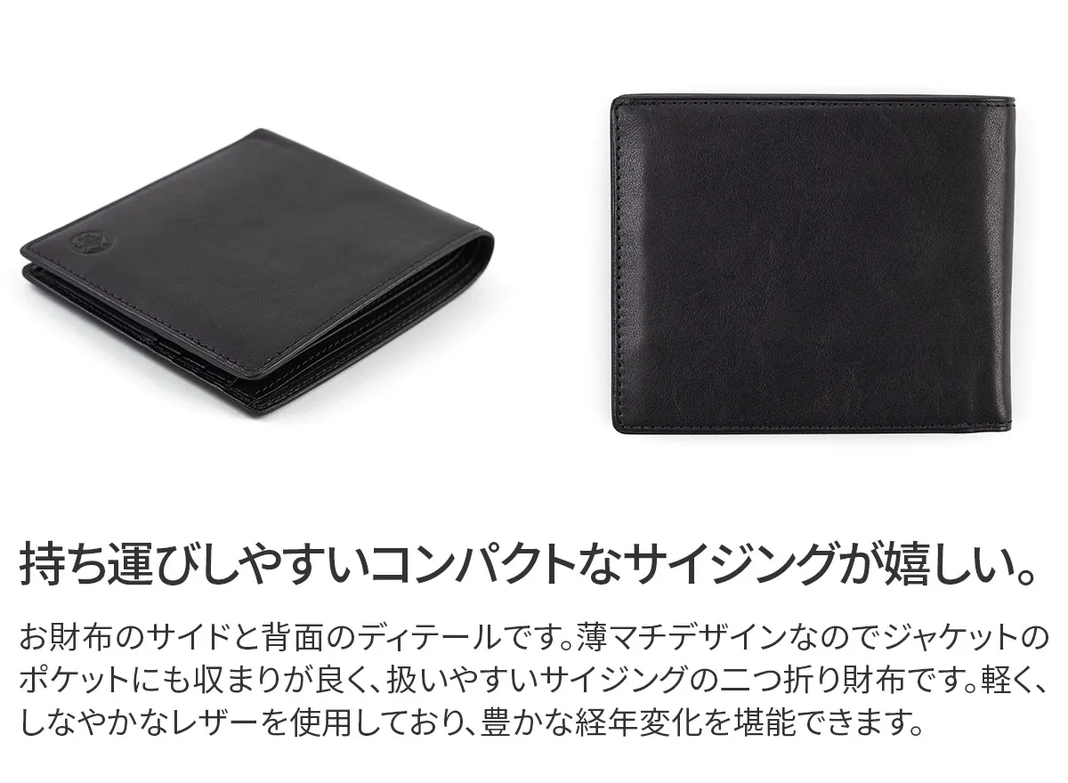 国産原皮による植物タンニン鞣しの革を0.8mmまで漉いた薄くて軽い財布シリーズ。 収納力も兼ね備えており、薄さの追求と併せて日常での扱いやすさに拘りました。使い込むごとに味わいが増し、カーフレザーのようなしなやかさと艶が深まっていきます。 少しアクセント効かせたステッチラインが、シンプルなフォルムを引き立てています。 カード類・紙幣をスッキリ収納できる小銭入れのない二つ折り財布。スマートなデザインでビジネスからプライベートまで幅広いシーンでお使いいただけるアイテムです。