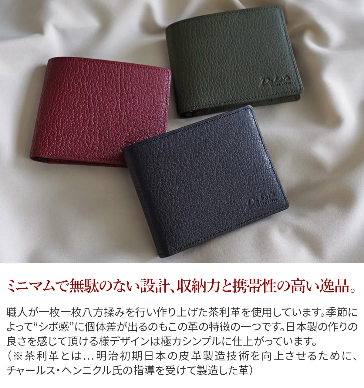 職人が一枚一枚八方揉みを行い作り上げた茶利革を使用しています。 季節によって“シボ感“に個体差が出るのもこの革の特徴の一つです。 日本製の作りの良さを感じて頂ける様デザインは極カシンプルに仕上げました。 革の魅力を存分に愉しめるシリーズです。 (※茶利革とは…明治初期 日本の皮革製造技術を向上させるために、チャールス・ヘンニクル氏の指導を受けて製造した革) シンプルな外観のスクエアフォルムと深みのあるカラーの大人のウォレットです。 肌馴染みの良いレザーが心地良く、エイジングを楽しみながらお使いいただけます。