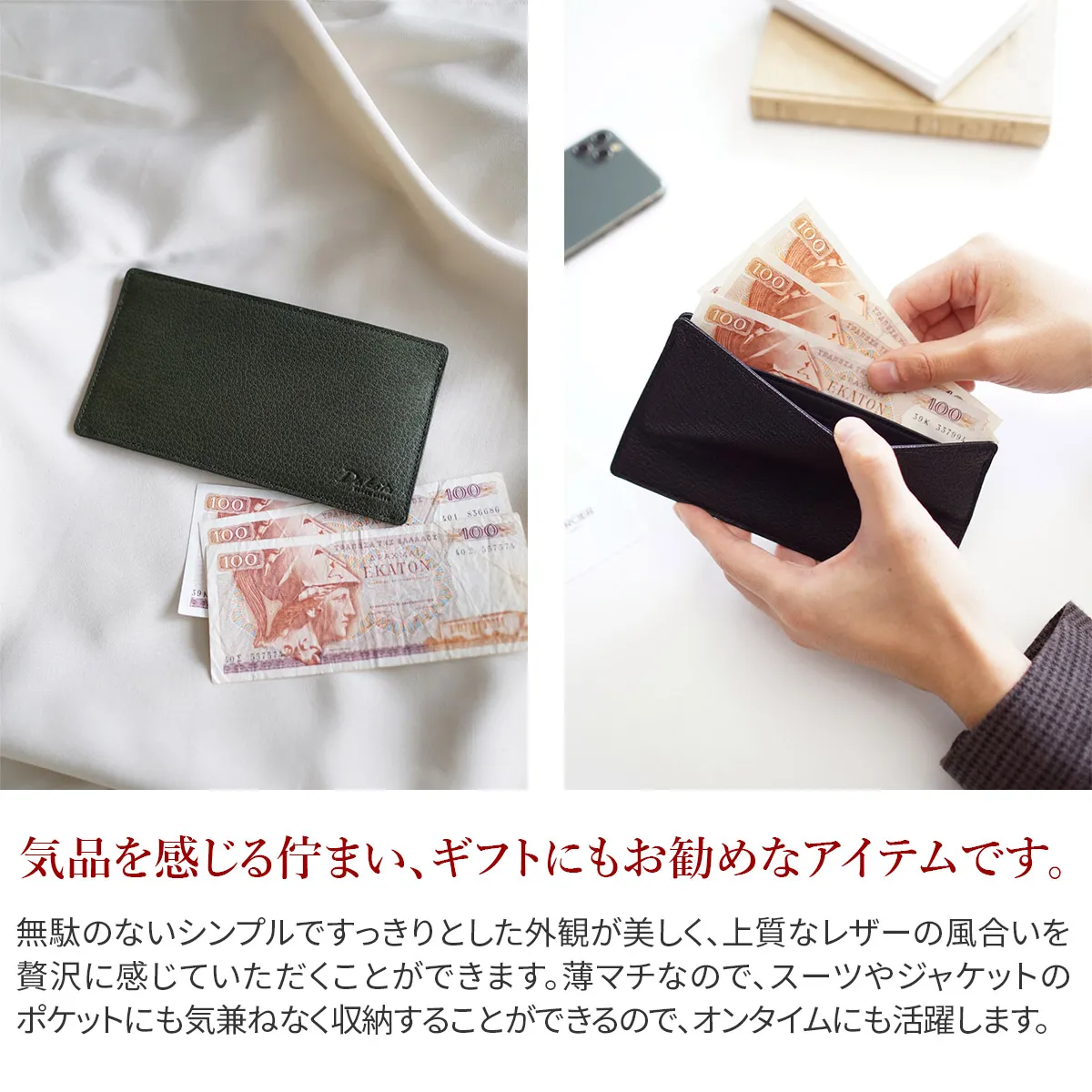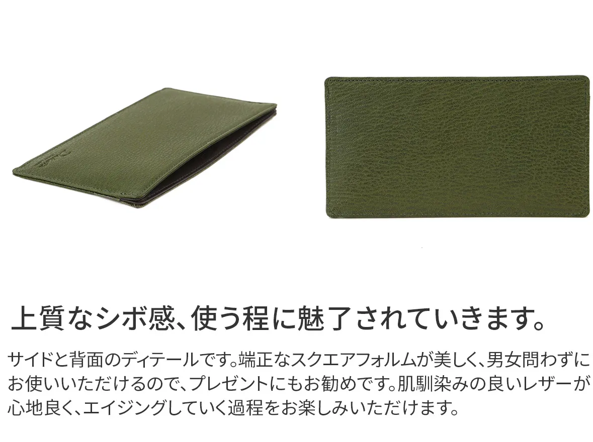 職人が一枚一枚八方揉みを行い作り上げた茶利革を使用しています。 季節によって“シボ感“に個体差が出るのもこの革の特徴の一つです。 日本製の作りの良さを感じて頂ける様デザインは極カシンプルに仕上げました。 革の魅力を存分に愉しめるシリーズです。 (※茶利革とは…明治初期 日本の皮革製造技術を向上させるために、チャールス・ヘンニクル氏の指導を受けて製造した革) 紙幣入れとカード入れのみの設計で、ミニマムスタイルの方にはぴったりなアイテムです。 ジャケットやスーツのポケットに収納していただくことができるので、オフィス使用にも最適です。