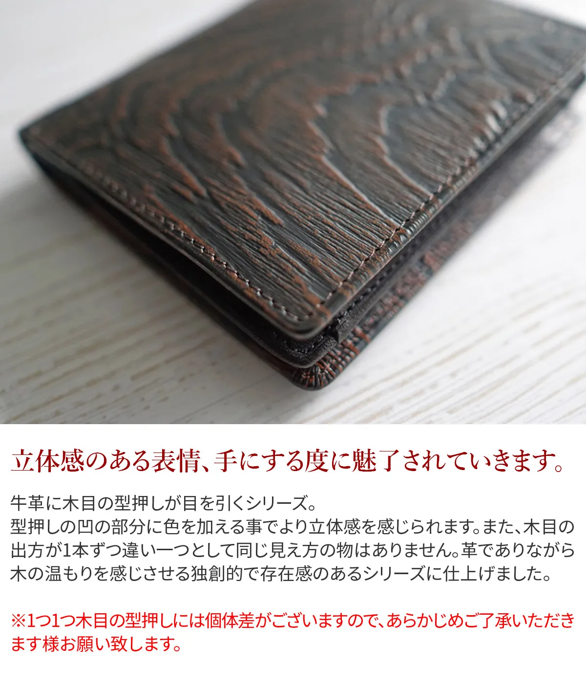 牛革に木目の型押しが目を引くシリーズ。 型押しの凹の部分に色を加える事でより立体感を感じられます。 また、木目の出方が1本ずつ違い一つとして同じ見え方の物はありません。 革でありながら木の温もりを感じさせる独創的で存在感のあるシリーズに仕上げました。 スリットが付いているので、カードや紙幣を挟んでいただけます。 小銭入れはBOXタイプなので、視認性にも優れており、出し入れがスムーズです。