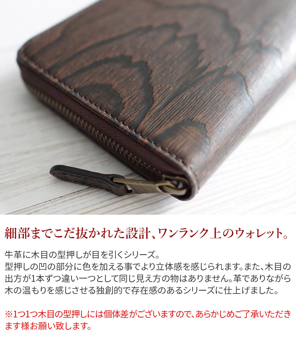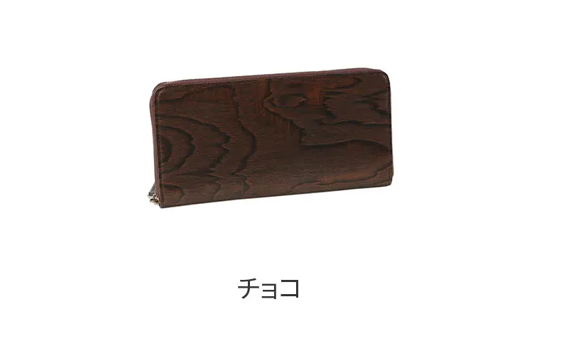 牛革に木目の型押しが目を引くシリーズ。 型押しの凹の部分に色を加える事でより立体感を感じられます。 また、木目の出方が1本ずつ違い一つとして同じ見え方の物はありません。 革でありながら木の温もりを感じさせる独創的で存在感のあるシリーズに仕上げました。 通帳も収納できるサイズのロングウォレットです。中身をたくさん収納してもスマートにお持ちいただけます。