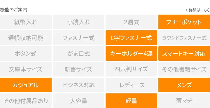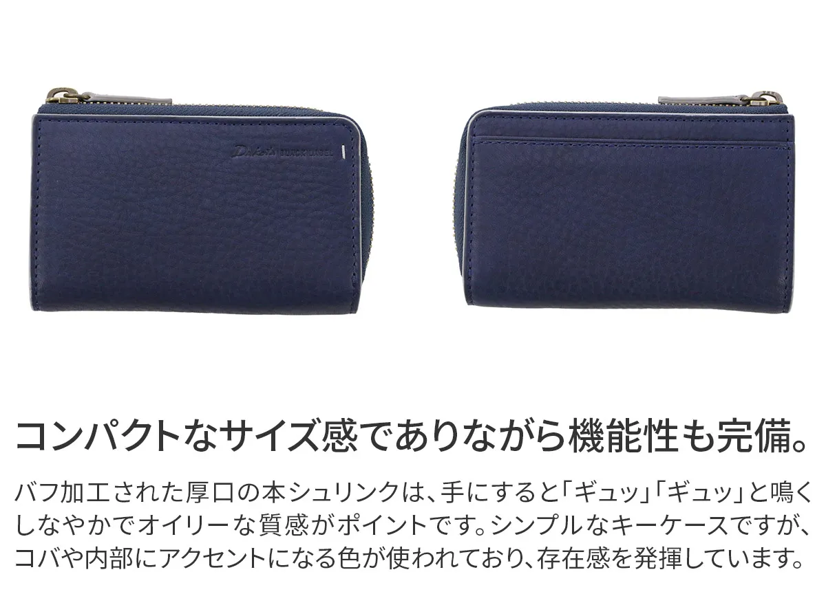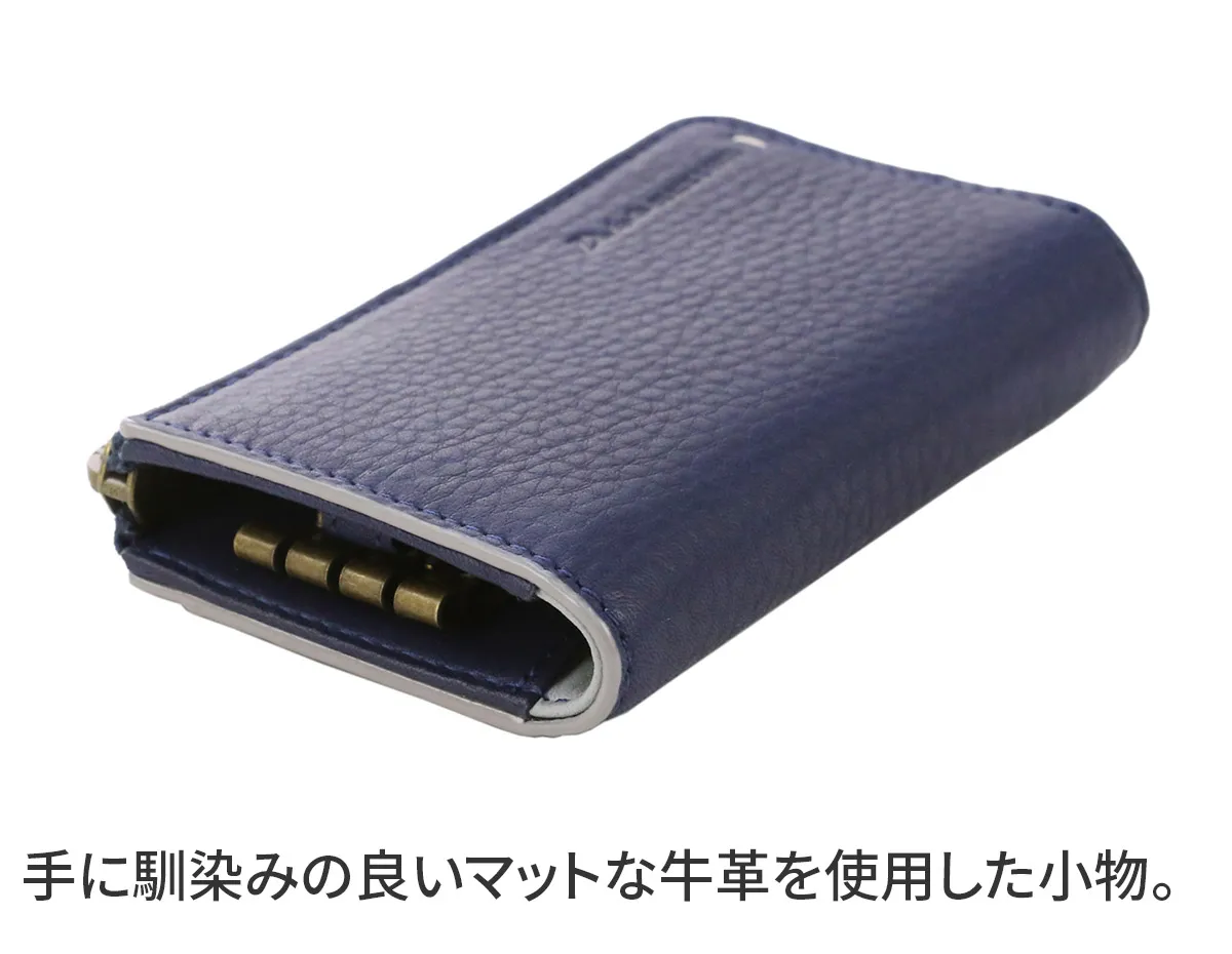 バフ加工された厚口の本シュリンクは、手にすると「ギュッ」「ギュッ」と鳴くしなやかでオイリーな質感がポイントです。 シルエットを強調したアクセントカラーが洒落感と存在感をプラスしています。 一般的なシリンダーキーと、車のスマートキー、家のカードキー等、多種多様な鍵を一つにまとめてお持ちいただけるハイスペックなキーケースになります。 スタンダードな形で使い心地も抜群です。贈り物にもお勧めの逸品です。
