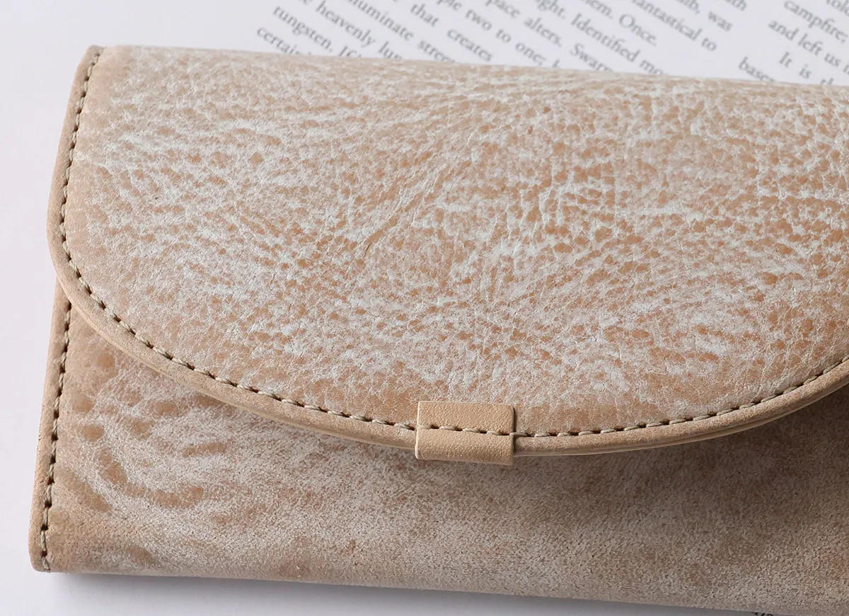 クリームのようなやわらかな色合いと、しっとりとした質感が魅力のレザーシリーズ。 使い込むほどに艶と深みが増し、革本来の経年変化を楽しめる仕上がりです。 丸みを帯びたフラップと、さりげなくあしらったヌメ革のワンポイントが印象的な名刺入れ。 マチ付きのメインポケットは十分な収納力があり、もらった名刺を分けて入れられるカードポケットも備えています。 シンプルで上品な佇まいは、ビジネスシーンにも自然に馴染むデザイン。 使うほどに味わいを深めていくため、ギフトにもおすすめのアイテムです。