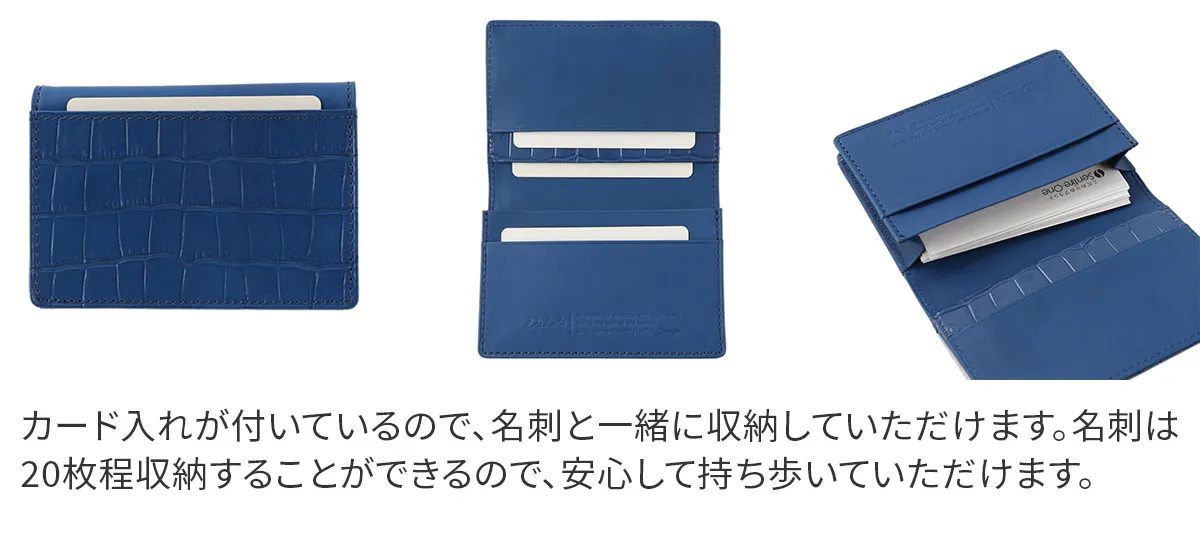 材料のコンビネーションがスタイリッシュで、上質な佇まいを感じさせるアイテムです。 タンニンで鞣した革を使用しているので、使う程に艶が上がり、味わいも増していきます。 名刺と一緒にカードも収納できる仕様となっています。 異なる素材を合わせる事で、立体感が生まれ存在感を放つアイテムです。 時間の経過と共に深みが増していく表情をお楽しみいただけます。
