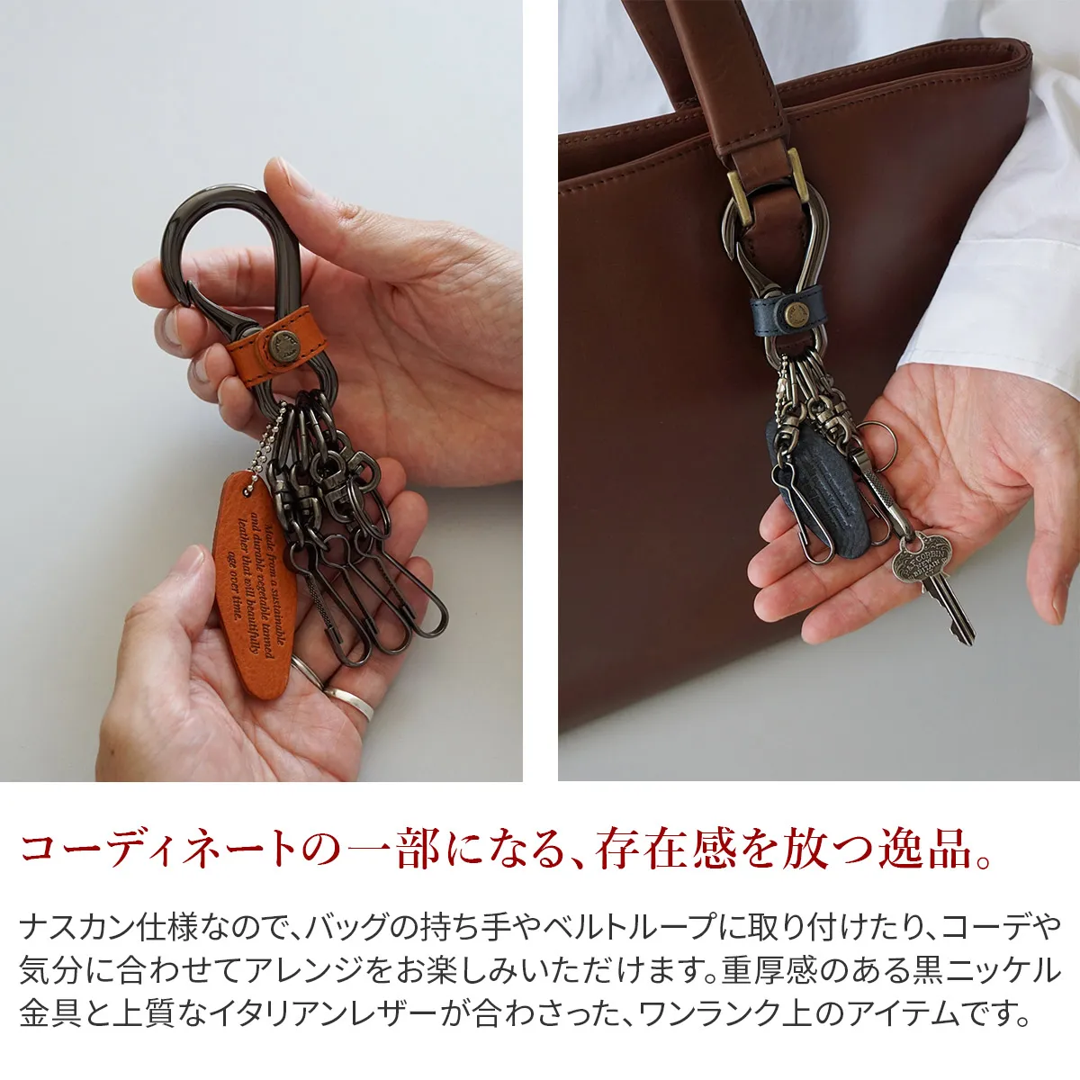 イタリア製のヌメ革を使用し、日本の職人によっていくつもの作業工程を経て完成されたクラフトマンシップ溢れる逸品。 永きに渡って愛されてきた、ミネルバアクソリオシリーズのデザインやディテールを一新。 高級なイタリア製の牛革と重厚感のある黒ニッケルの金具が合わさった上質なキーホルダーです。 5連のキーリングが付いており、自宅や職場の鍵等まとめて取り付けていただけます。