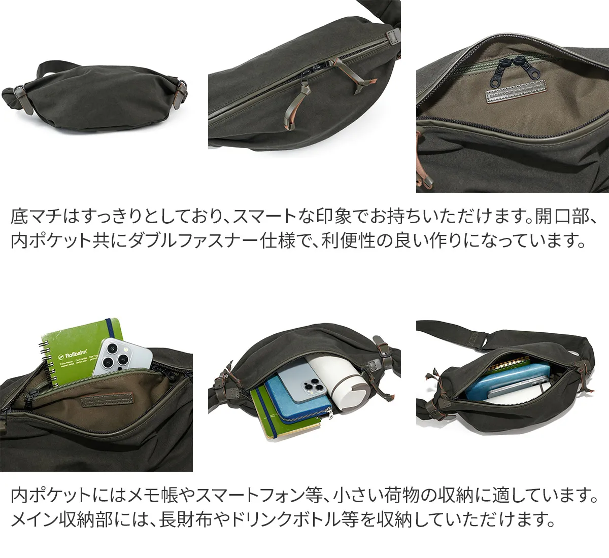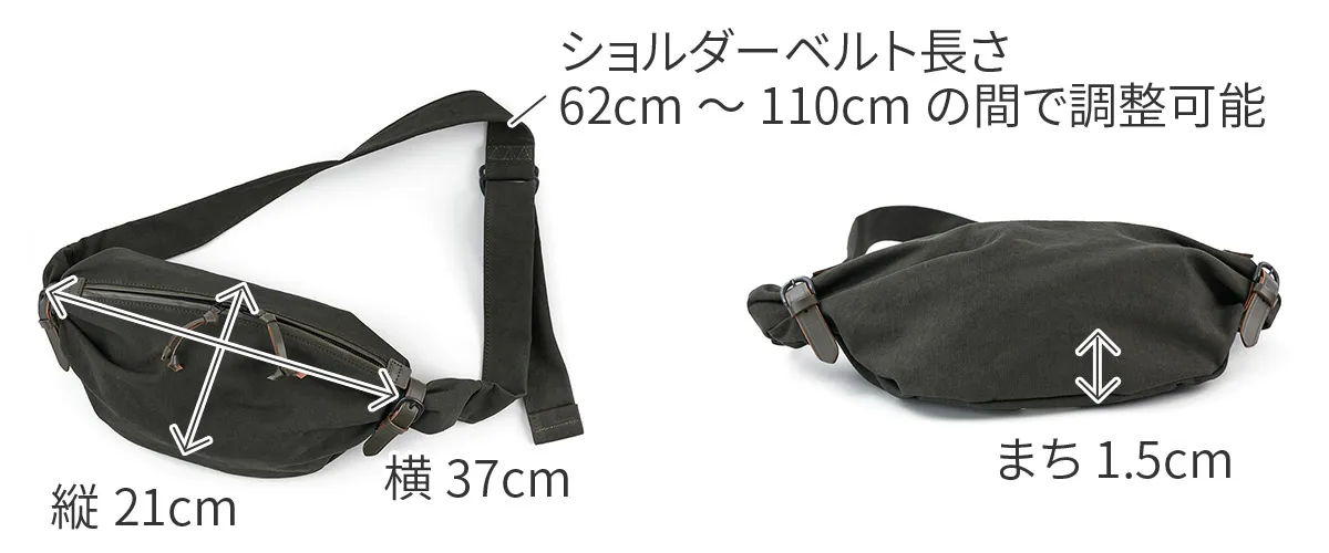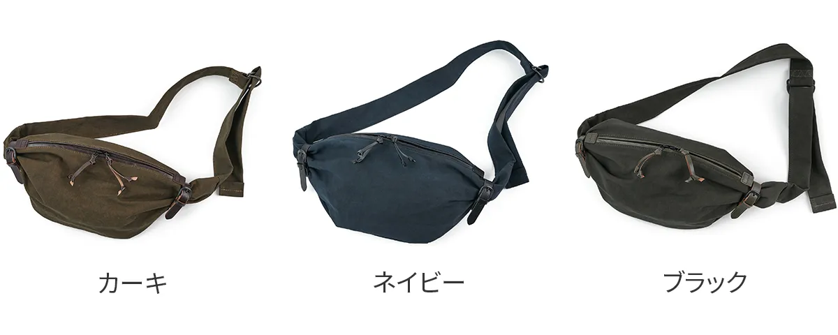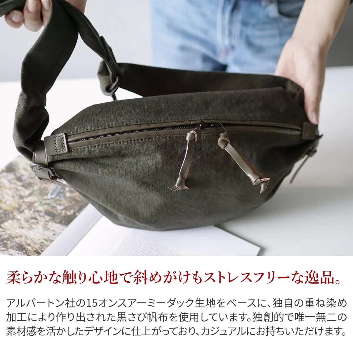 ALBERTON社 15oz ARMY DUCK をベースに独自の重ね染め加工により作り出された黒さび帆布。独自の雰囲気をまとった唯一無二の素材となりました。 両端を革で絞ったどこか和風の面持ちのスリングバッグ。風呂敷で包み込むような作りは、体へのフィット感もよく、収納力もしっかりとあります。左右問わず、前かけ・後ろかけ問わず使いやすい形です。長財布や600mlのペットボトルも収納できるサイズ感で、アクティブなシーンにも活躍してくれます。