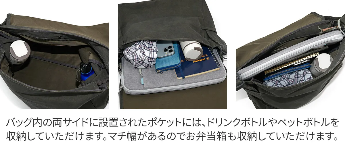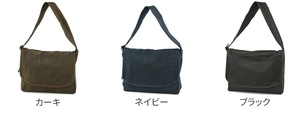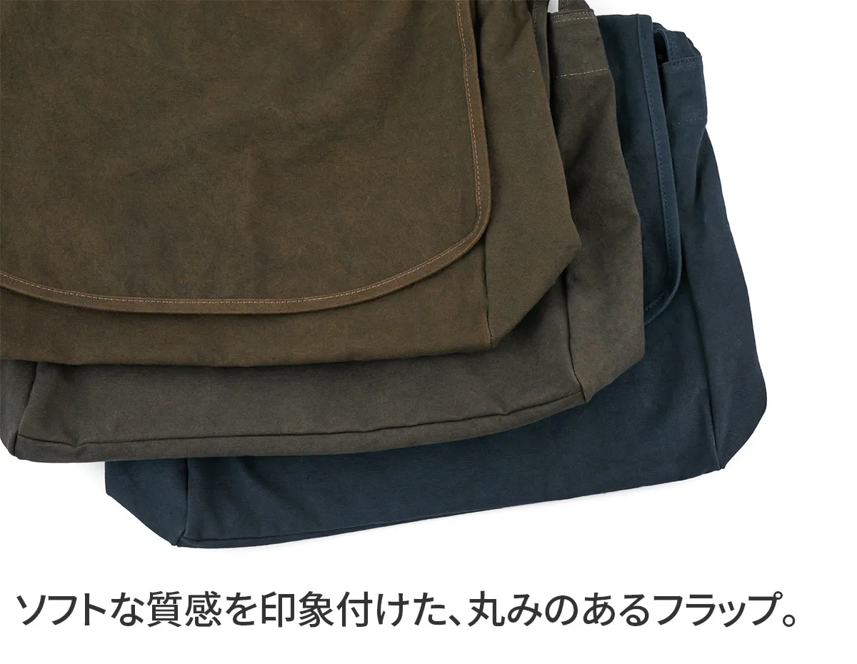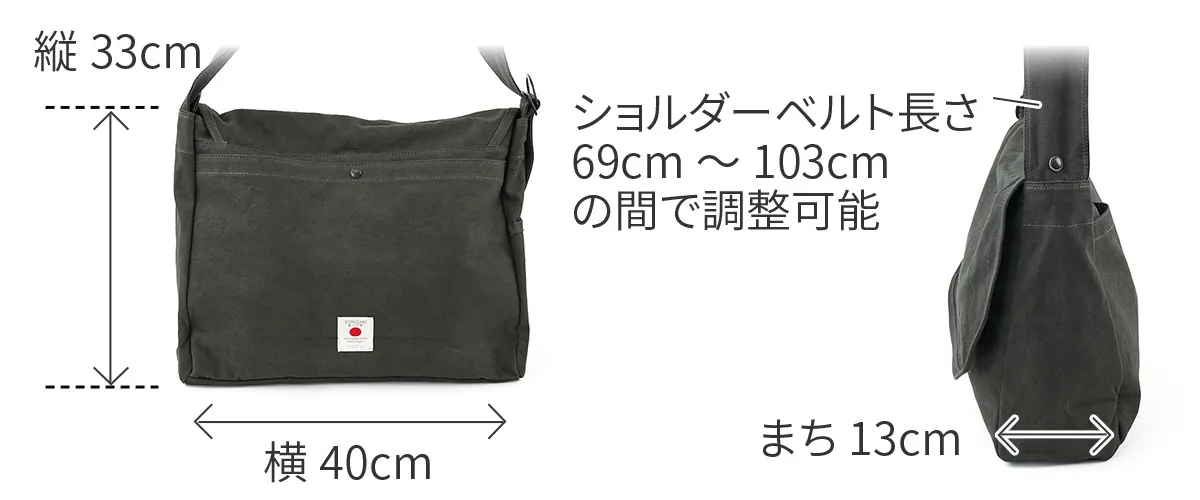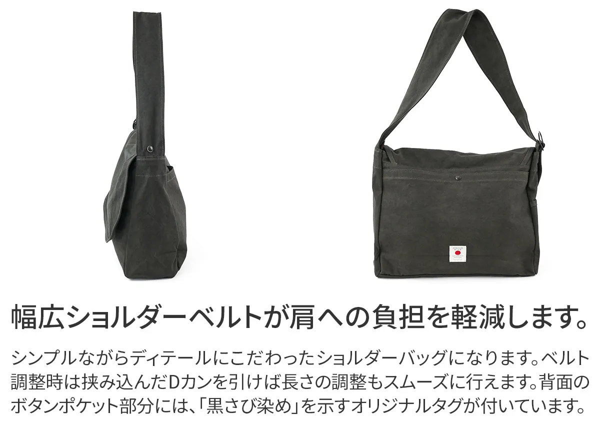 ALBERTON社 15oz ARMY DUCK をベースに独自の重ね染め加工により作り出された黒さび帆布。独自の雰囲気をまとった唯一無二の素材となりました。 シンプルながらディテールにこだわったショルダーバッグ。緩やかにラウンドさせたフラップ・太さを持たせたショルダーベルトも調整部にかけて細く変化するつくりになっています。ベルト調整時は挟み込んだDカンを引けば長さの調整もスムーズに行えます。間口にはファスナーとボタンを設置しており、どちらでもご使用いただけます。サイドに設置されたポケットは、ドリンクボトルや折り畳み傘などの収納に適しています。背面のポケットは内部にもポケットが設置されており、小物の収納もしやすい作りになっています。