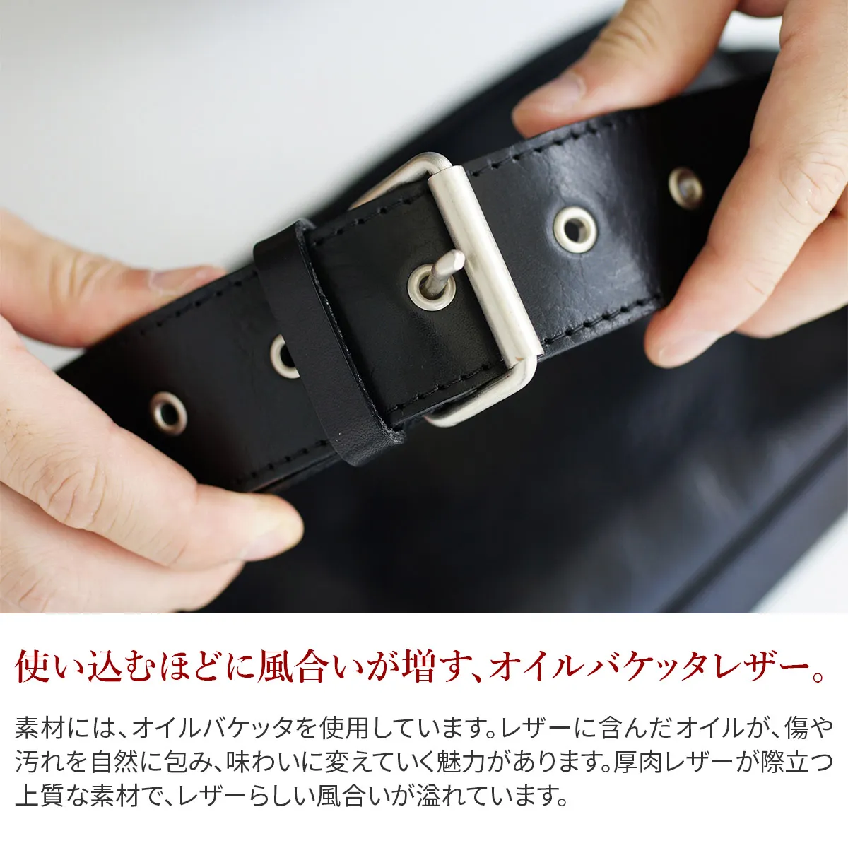 カジュアル過ぎず堅苦しくない、全体的に落ち着いた色使いで大人の雰囲気をかもしだす逸品です。一見、ウエストバッグのようなデザインにも遊び心が感じられます。 飽きのこないシンプルなデザインに同素材のカラーコンビネーションを活かしたシリーズ。 BAGGY PORTの定番素材、オイルバケッタを使用しています。 革に含んだオイルが、傷や汚れを自然に包み、味わいに変えていくのも魅力の一つです。 ※ベルトの長さ上、ウエストバッグとしてはお使い頂けません。
