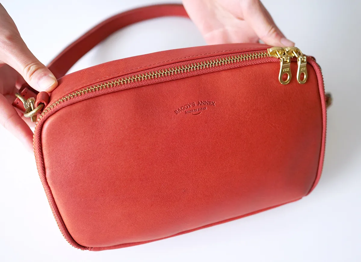 発色の良いカラーがコーディネートのポイントになる、B6サイズ対応のミニショルダーバッグです。開口部はダブルファスナー式で大きく開くので、荷物の出し入れがしやすい作りとなっています。ショルダーベルトは金具で取り外し可能なので、クラッチバッグやポーチとしてもお使い頂けます。内部にはカード収納ポケットが6ヶ所あり、スマホを収納するのに便利なファスナーポケットがあります。 吟面と床面の両サイドからオイルを染み込ませたWオイル加工の為、より深い経年変化が楽しめる牛革素材です。程よい肉厚感で、もっちりとやわらかいレザーです。