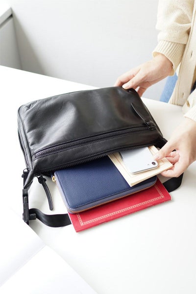 ソフトで軽量の牛革を使用しています。サイドのファスナーを開けると、マチが広がり収納力がアップします。コンパクトになるので、旅行のバッグとしてスーツケースに収納することもできます。 シンプルなデザインで性別問わずお持ちいただける2WAYショルダーバッグ。A5サイズの書類が余裕を持って収納できるサイズ感となっております。ショルダーベルトには差し込みバックルが2つ付いており、間のショルダーベルトを取り外していただくことにより手持ちスタイルがお楽しみいただけます。持ち方のアレンジができるので、ご家族やパートナーの方と共有してお持ちいただくのもお勧めです。