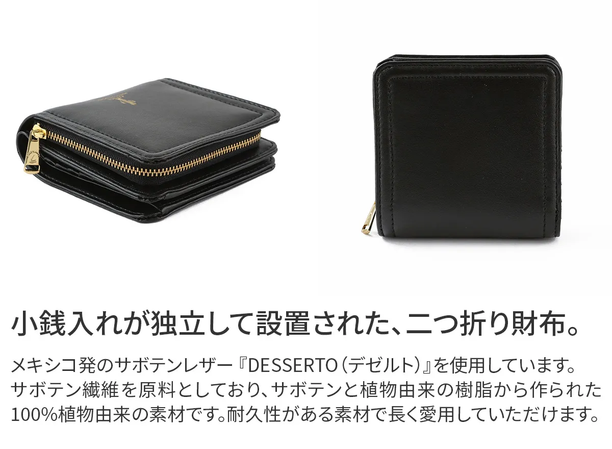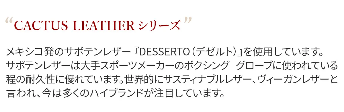 メキシコ発のサボテンレザー 『DESSERTO(デゼルト)』を使用しています。 サボテンレザーは大手スポーツメーカーのボクシング グローブに使われている程の耐久性に優れています。 世界的にサスティナブルレザー、ヴィーガンレザーと言われ、今は多くのハイブランドが注目しています。 【サボテンレザーとは】 サボテン繊維を原料とするレザーのことを言います。 サボテンと植物由来の樹脂から作られた100%植物由来の素材です。 【サボテンレザーの特徴】 本革のような滑らかな手触りで、水や汚れに強く、軽量且つ、耐久性にすぐれた素材です。 化学薬品を使用していないことや、CO2が排出されないことも特徴です。 サボテンから生まれたサスティナブルなヴィーガンレザーを使用したアイテムです。