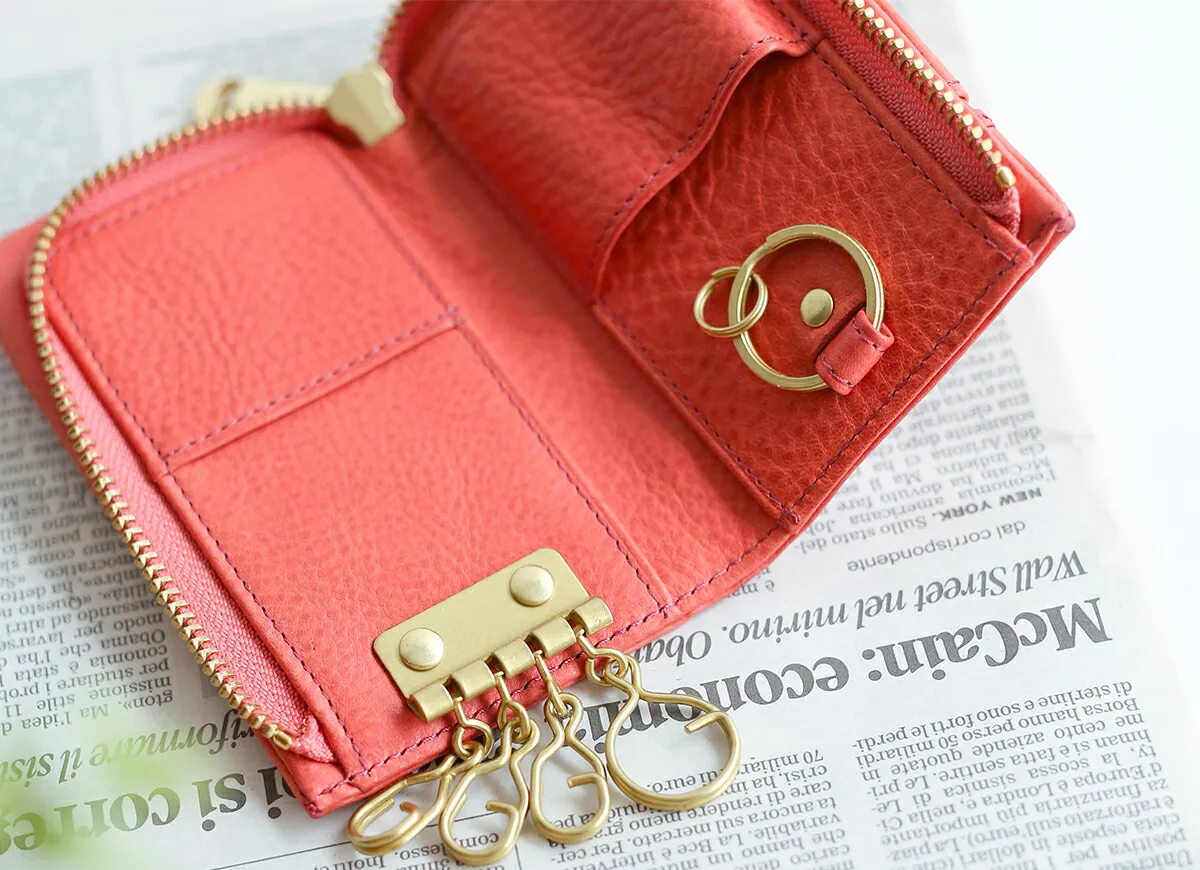 スマートキーの収納が可能な上質レザーのキーケースです。外側と内部にカード入れが3ヶ所あり、電車などのICカードの収納に便利です。鍵の収まりをよくするカバーのある作りで、鍵同士がぶつかりにくく使い心地が良いです。ファスナーの引き手には、上品な光沢感が印象的なオリジナルの金具があり、ワンポイントとなっています。 素材には、イタリアンレザー(ミネルバボックス)を使用しています。イタリアのタンナー「バダラッシィ・カルロ社」で手鞣し、手染めと丁寧に仕上げられた高級な革素材です。植物タンニンで鞣した牛革に、オイルをたっぷりと含ませ時間をかけて作られています。お使いいただく程に、色が深まり、艶やかな表情に育つので、本革ならではの経年変化をお楽しみいただける革素材となっております。