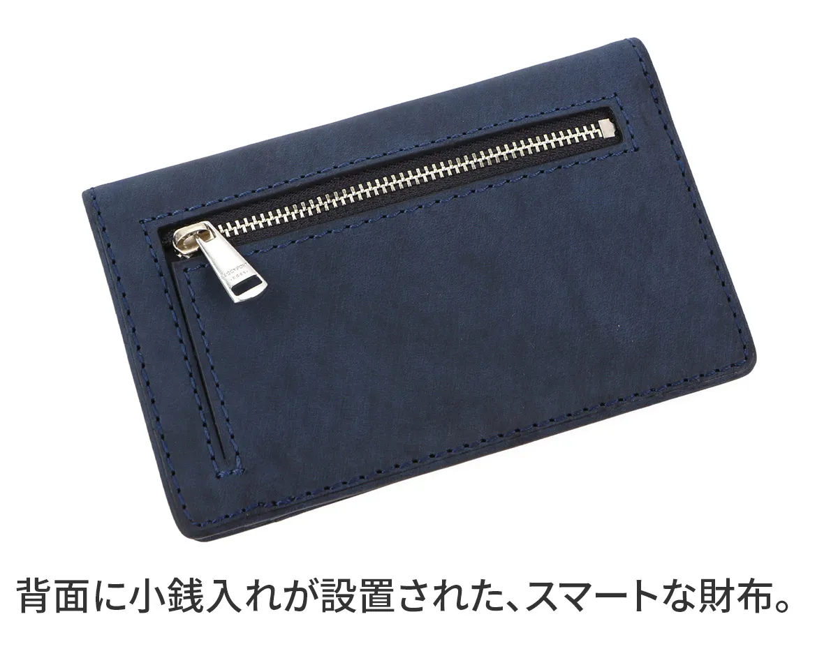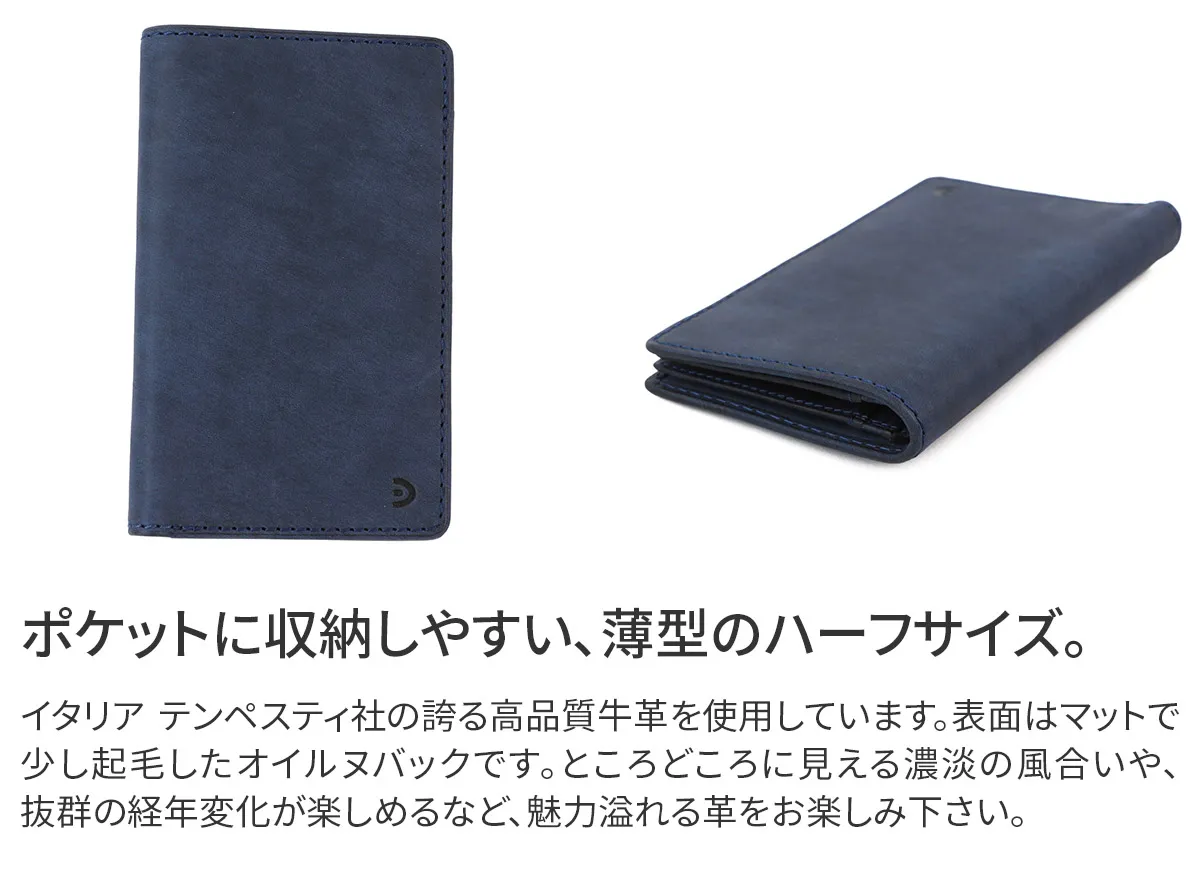 イタリア テンペスティ社の誇る高品質牛革を使用しています。表面はマットで少し起毛したオイルヌバックです。 シンプルなデザインに「BAGGY PORT」オリジナルの引手で綺麗な仕上がりになっています。 【オイルレザー特有の経年変化で共に成長する素材】 通常の2倍のオイルを使用した鞣しの工程で、繊維までしっかりとオイルが浸透しているため、しっとりとしなやかな質感です。 ところどころに見える濃淡の風合いや、抜群の経年変化が楽しめるのも、この革の魅力です。 色は深みを増し、艶がしっかりと出てきます。 人気のハーフサイズは最低限の収納は確保したまま、より薄型にしてパンツポケットやスーツの内ポケットにも収納しやすいサイズ感になっております。サイズ感は抑えながらも、充分な収納力を持ち合わせたアイテムとなっています。