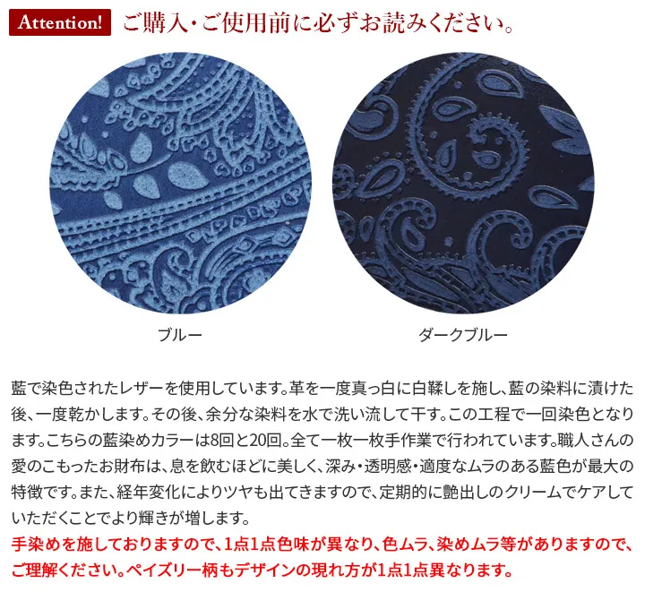 [シリーズ] ペイズリー柄の型押しを施し、浮き出た部分に削りを施すことで、細かい柄まで細部に表現されています。熟練の職人技術により、定番のスムースレザーを奥行のある柄の陰影が美しい存在感のある革へと変化させています。内側は明るい白ヌメカラーにすることで、メリハリのあるデザインに仕上げられています。 [藍染レザー] 藍で染色されたレザーを使用しています。革を一度真っ白に白鞣しを施し、藍の染料に漬けた後、一度乾かします。その後、余分な染料を水で洗い流して干す。この工程で一回染色となります。こちらの藍染めカラーは8回、20回。全て一枚一枚手作業で行われています。そんな職人さんの愛のこもったお財布は、息を飲むほどに美しく、深み・透明感・適度なムラのある藍色が最大の特徴です。また、経年変化によりツヤも出てきますので、定期的に艶出しのクリームでケアしていただくことでより輝きが増します。