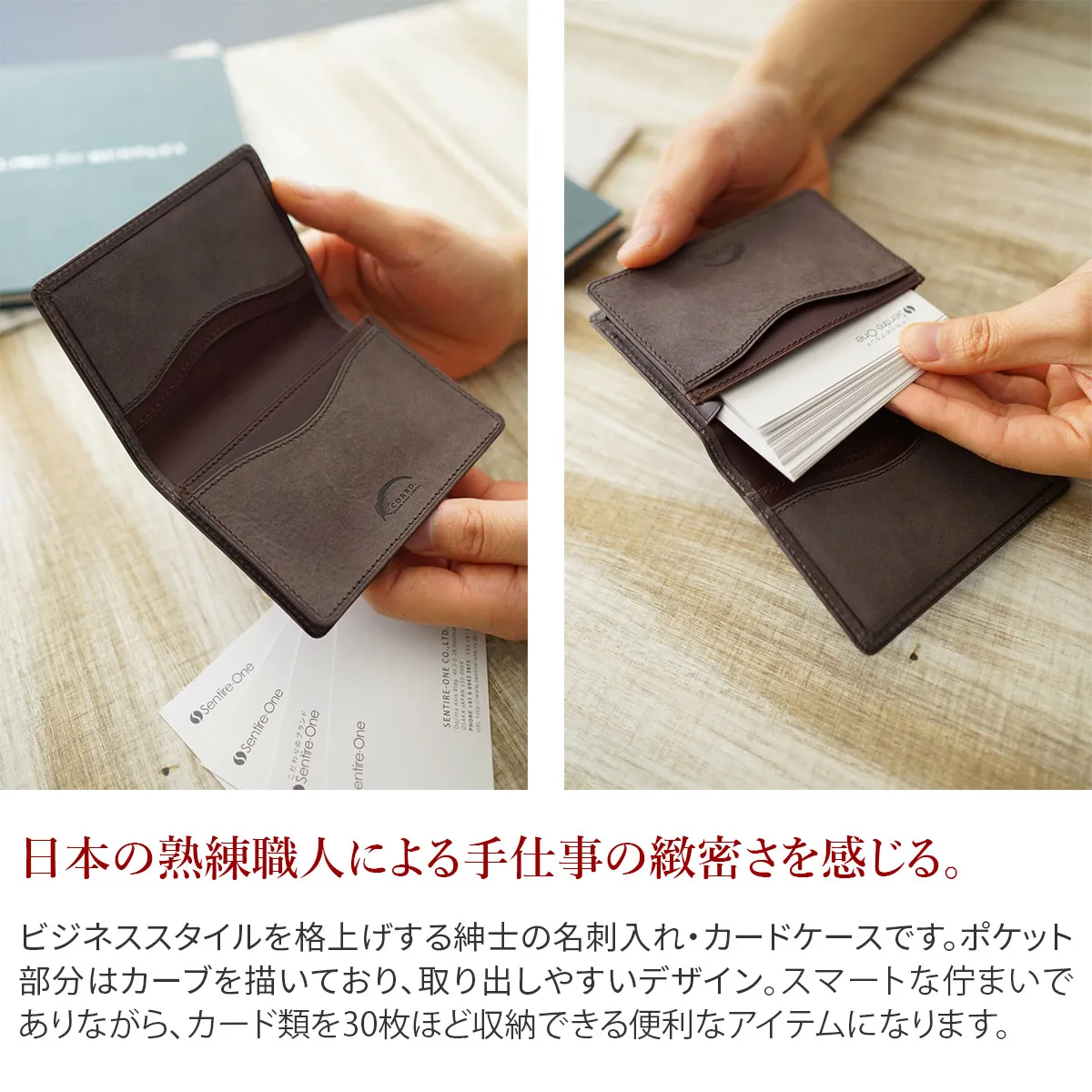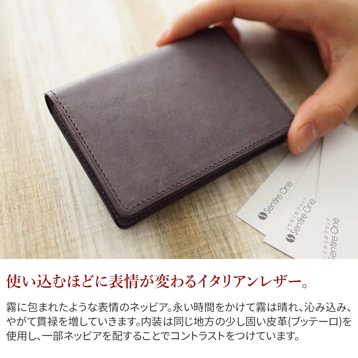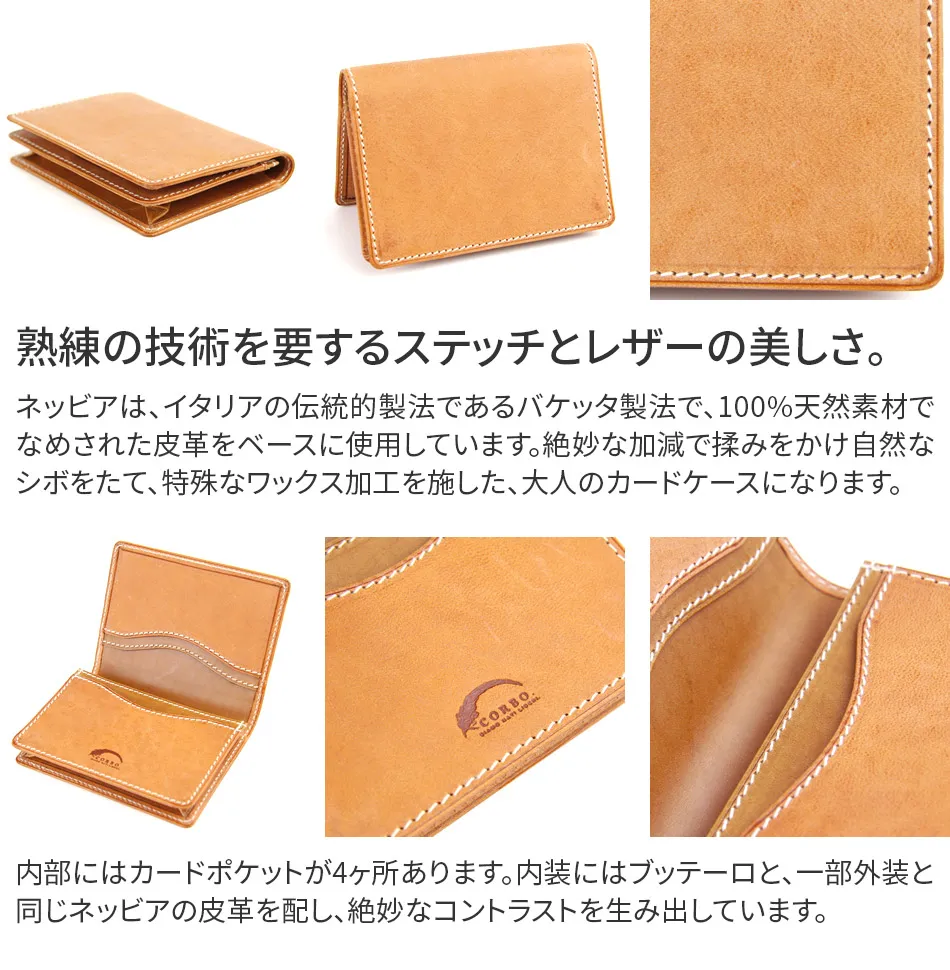 ビジネススタイルを格上げする紳士の名刺入れ・カードケースです。ポケット部分はカーブを描いており、取り出しやすいデザイン。スマートな佇まいでありながら、カード類を30枚ほど収納できる便利なアイテムになります。 霧に包まれたような表情のネッビア。永い時間をかけて霧は晴れ、沁み込み、やがて貫禄を増していきます。内装は同じ地方の少し固い皮革(ブッテーロ)を使用し、一部ネッビアを配することでコントラストをつけています。