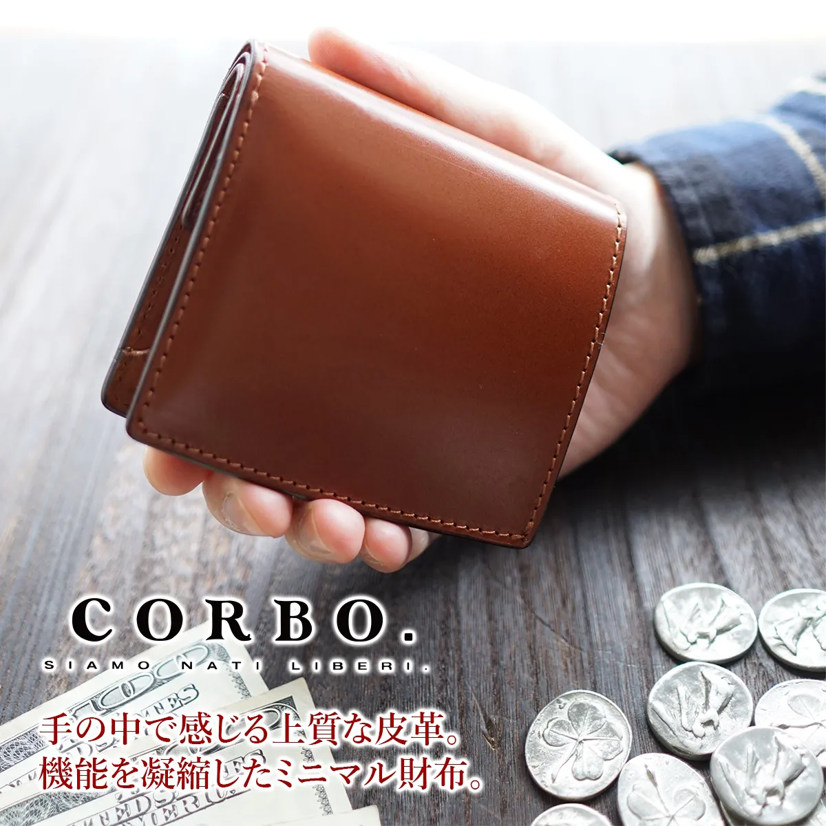 CORBO.(コルボ)-face Bridle Leather G.E.W.- フェイス ブライドルレザー グッドイナフウォレット 小銭入れ付き二つ折り財布 1LD-0239 上質なイギリス製レザーとイタリアンレザーを使用した総革仕立て。 非接触ICカード誤作動防止材内蔵で、高機能コンパクト財布。