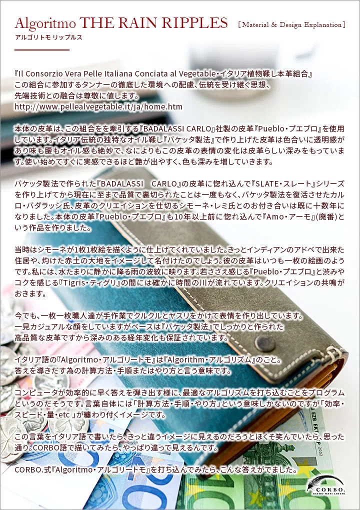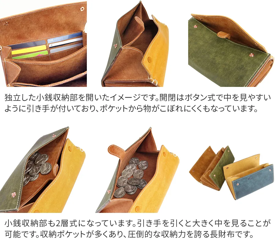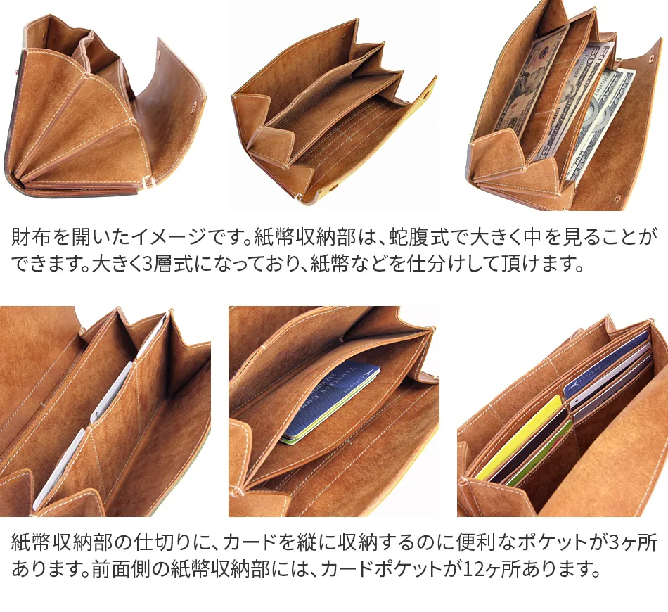 蛇腹式に開閉するので中がとても見やすい作りとなっています。また、仕切りにもカード類を収納するのに便利なポケットがあり 圧倒的な収納力を誇る長財布です。 イタリア伝統の独特なオイル鞣し『バケッタ製法』で作り上げた皮革は色合いに透明感があり味も腰もオイル感も絶妙で、 なによりもこの皮革の表情の変化は皮革らしい深みをもっています。使い始めてすぐに実感できるほど艶が出やすく、 色も深みを増していきます。