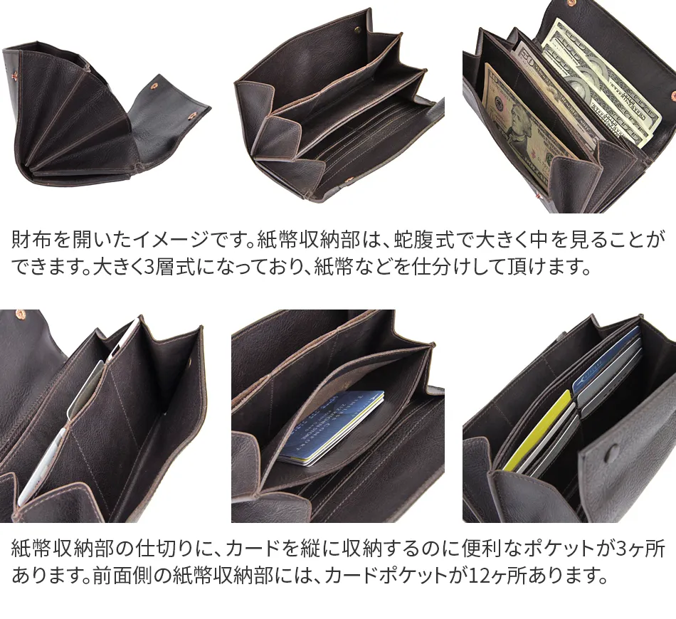 水のうねりで揉み込まれたシボは、川面のさざ波、とろりとした凪、立体的な光の強弱をイメージされた上品さがあります。 また、水打ちしたことで皮革全体が引き締まりコシがあります。 蛇腹式に開閉するので中がとても見やすい作りとなっています。 また、仕切りにもカード類を収納するのに便利なポケットがあり圧倒的な収納力を誇る長財布です。 素材は、色合いに透明感があり味も腰もオイル感も絶妙で、なによりもこの皮革の表情の変化は皮革らしい深みをもっています。 使い始めてすぐに実感できるほど艶が出やすく、色も深みを増していきます。
