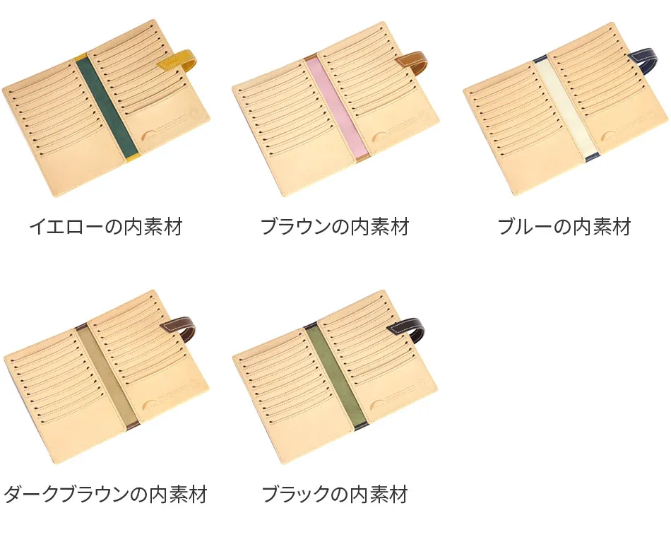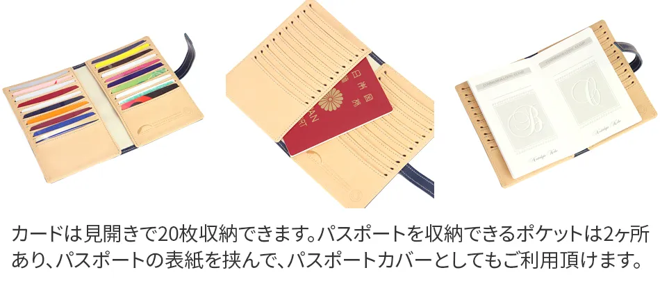20枚ものカードを両開きでスマートに管理できるカードケースです。パスポートサイズで、多くのカードを出来るだけ薄く収納できるように作られています。カード収納部の曲線と両端に配した涙型の穴はカードの出し入れをしやすいようになってます。スマートに持ち運ぶことが可能です。パスポートの収納やパスポートカバーとしてもお使い頂けます。 素材には、発色がよくオイルの入りが良いイタリアン牛革ショルダーオイルヌメ(ブッテーロ)を使用しています。お使いいただく程に上質な本革ならではの風合いをお愉しみ頂けます。