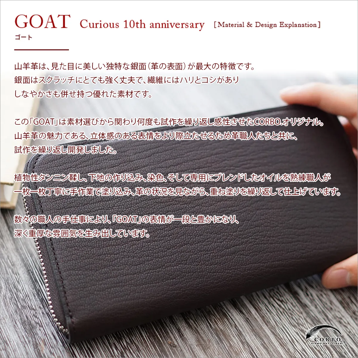 タンニンで鞣された山羊ヌメ革を染料で染め、下地を作り込みます。オイルをたっぷりと塗り込み、数日寝かせ、自然の発色を待ちます。極力伸ばさず、山羊革の表情を際立たせる様に仕上げています。 山羊革は銀面が非常に強いのが特徴です。擦れにくく、逆にツヤを増していきます。革の厚みを活かし、切れ目に磨きをかけました。余分な物は削ぎ落とし、堅牢と柔軟を併せ持つ少し大人の“Curious”に仕上げました。