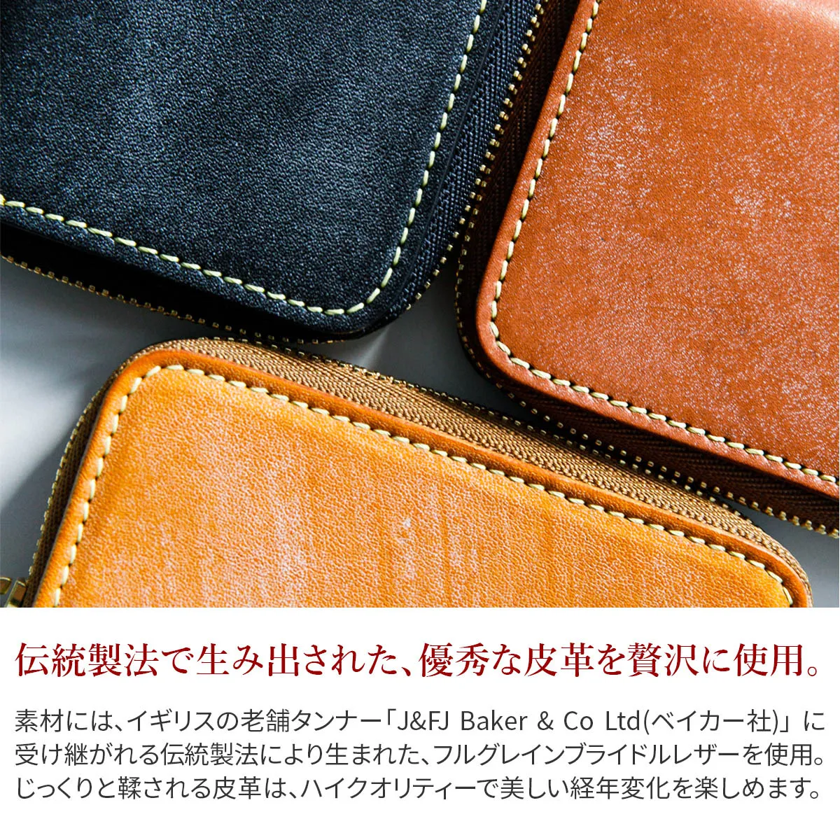 【フルグレインブライドルレザーについて】 イギリスの老舗タンナー「J&FJ Baker & Co Ltd(ベイカー社) 」に綿々と受継がれる伝統製法により、オークバーク(オーク樹皮)タンニンを使いじっくりと月日をかけて鞣される皮革には、貫禄の風合いが醸し出されます。 ブライドルレザーは元来馬具用に作られる皮革のため、蝋の浸み込みが良くなる様に銀面(革の表層・グレイン)を軽く削るのが一般的なのですが、ベイカー社のフルグレインブライドルレザーは工芸品向けに銀面を削ることなく、じっくりと時間をかけて、染色や加脂、手作業で蝋を塗り込むことで克服しています。銀面を活かすことで現れる貫禄ある自然な美しさと、堅牢さを兼ね備えた秀逸な皮革です。※ブライドルレザーの特徴でもある「ブルーム」についてたっぷりと塗り込んだ蝋分が銀面にうっすらと浮かぶ現象です。「ブルーム」は、使い込む事で皮革の艶へと変わっていきます。 【内装のイタリアンオイルレザー Vacchetta Leather(バケッタレザー)について】 植物タンニン鞣しであるバケッタ製法で鞣されたレザーを使用しております。 バケッタ製法とは、ケブラチョ、チェストナット(栗)、ミモザ(アカシア)などの木から抽出されるタンニンエキスを原皮の芯まで時間を掛けてしっかりと浸透させ 独自のレシピで調合された牛脂など天然成分のみのオイルをじっくりと加脂し乾燥にもゆっくりと時間をかけて皮革をなめす伝統的製法です。加工には30日ほどの時間をかけるので、浸透しにくいオイルが隅々までしみわたり独自の風合いと腰、深みのある表情を生み出します。この皮革で作られた製品は、使いはじめてすぐに実感できるほど、味わい深い艶を増し タンニン鞣しならではの愛着の湧く色の変化を楽しんでいただく事ができます。「イタリア植物タンニン鞣し本革組合」によって、人や環境を破壊する有害物質を一切使わず、100%天然の植物エキスを使って加工されている事が保証されています。