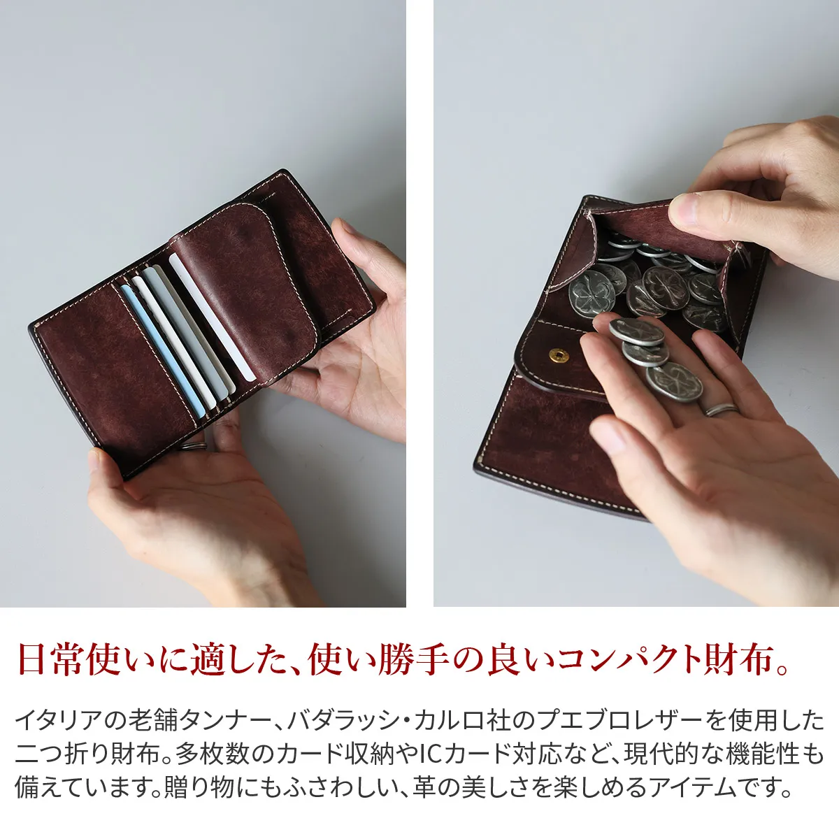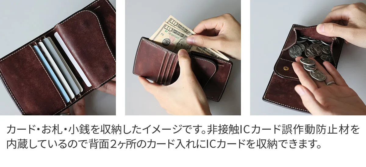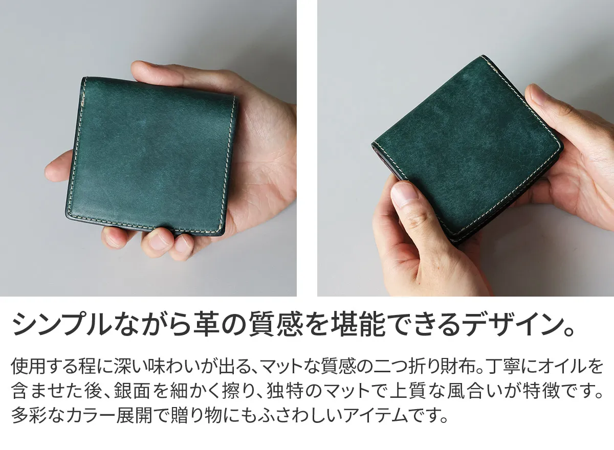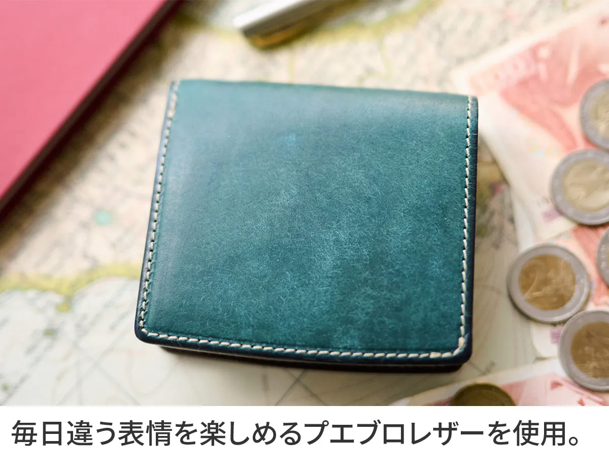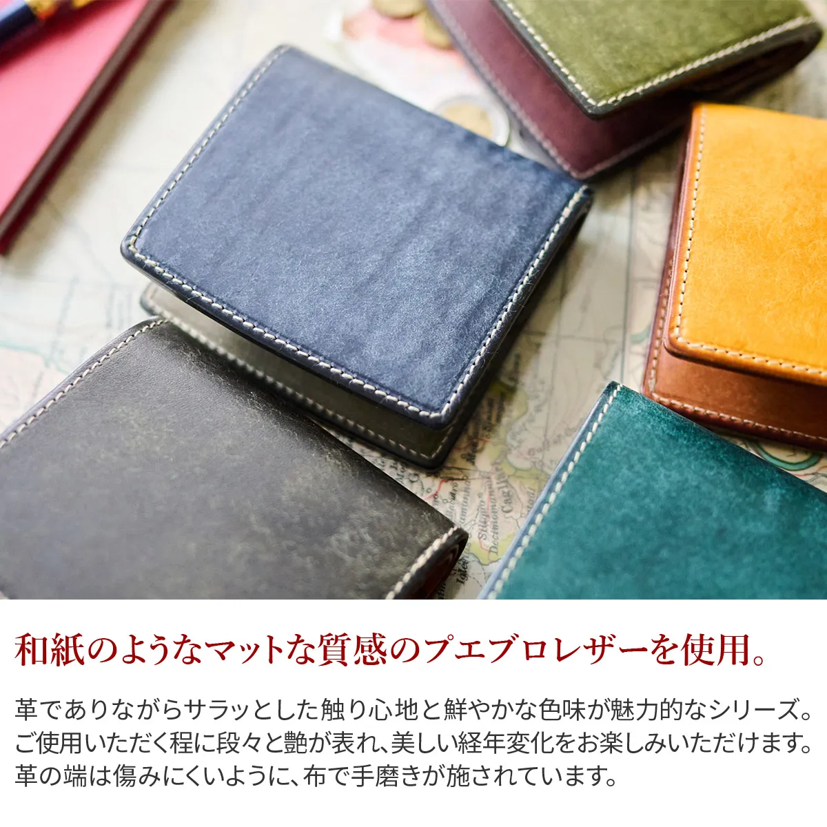 SLATE PUEBLO(スレート プエブロ)シリーズより、コンパクトな二つ折り財布。 素材にはイタリアの老舗タンナー バダラッシ・カルロ社 が手がけるプエブロレザーを採用しています。 丁寧にオイルを含ませた後、銀面を細かく擦り、独特のマットで上質な風合いが特徴です。 使い始めから美しい表情を見せ、時間とともに深い艶が宿る“劇的な経年変化”も魅力の1つ。 縫製・コバ処理・パーツ選定に至るまで徹底して美しく、毎日触れる小物だからこそ、手にした時の心地よさを追求。 コンパクトな二つ折り仕様でありながら、多枚数のカード収納やICカード対応など、現代的な使いやすさも備えています。 非接触ICカード誤作動防止材を内蔵しているので、カード段背面とコインケース背面のカードポケットにICカードを入れることで、 エラーになることなく、それぞれのカードをお使いいただけます。 カラーは、ブルー・ネイビー・イエロー・カーキ・ダークグリーンなど、多彩なラインナップ。 男女問わず持ちやすい上品な色合いで、自分用にも贈り物にもふさわしい逸品です。