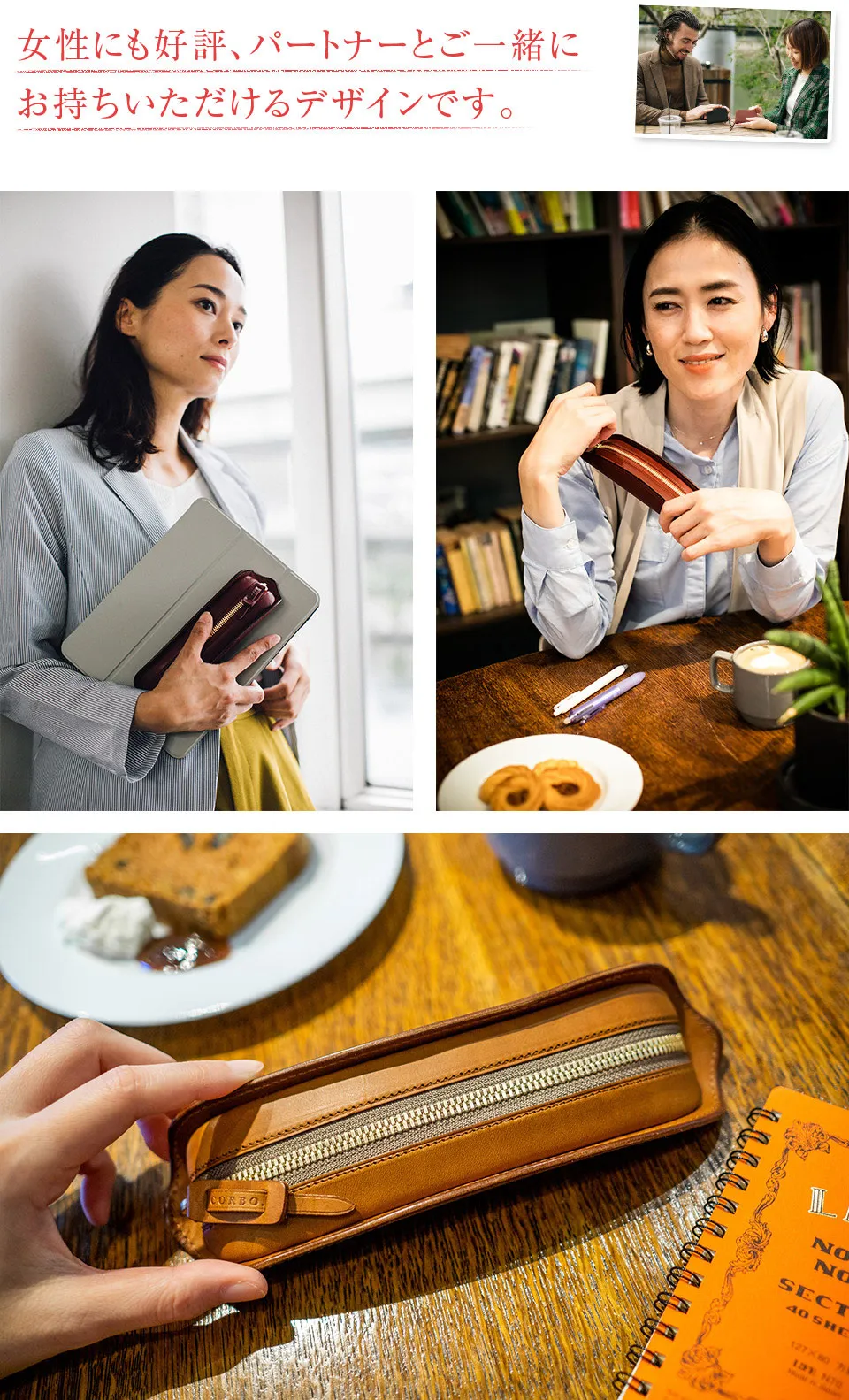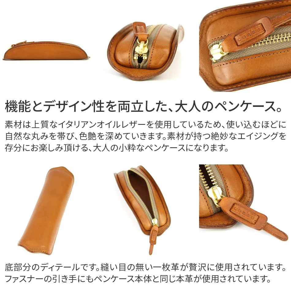 曲線を描くラインが個性的な、CORBO.の上質ペンケース。SLATEシリーズのイタリアンレザーの質感はいわずもがな、機能とデザインを両立したダブルステッチなど細部の仕立ての良さが光るペンケースです。デスク周りを小粋に彩る品の良い革小物として、プレゼントにも最適です。 SLATEは使い始めてすぐに実感できるほど艶が出やすく、色も深みも増していきます。皮革のアタリも出やすく、エイジングを愉しめる革の代表格とも言えるでしょう。また、エイジング後を考慮してステッチの色を濃くしたりと、使ってからの配慮が施されています。まさに、使用していく中で完成してゆく逸品です。
