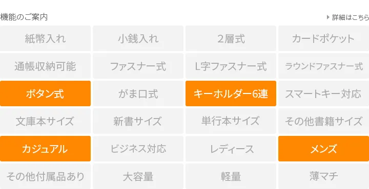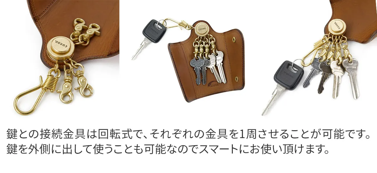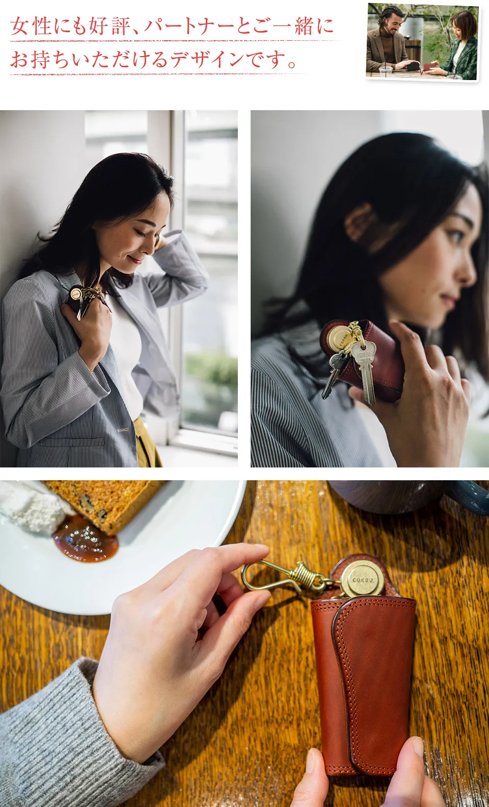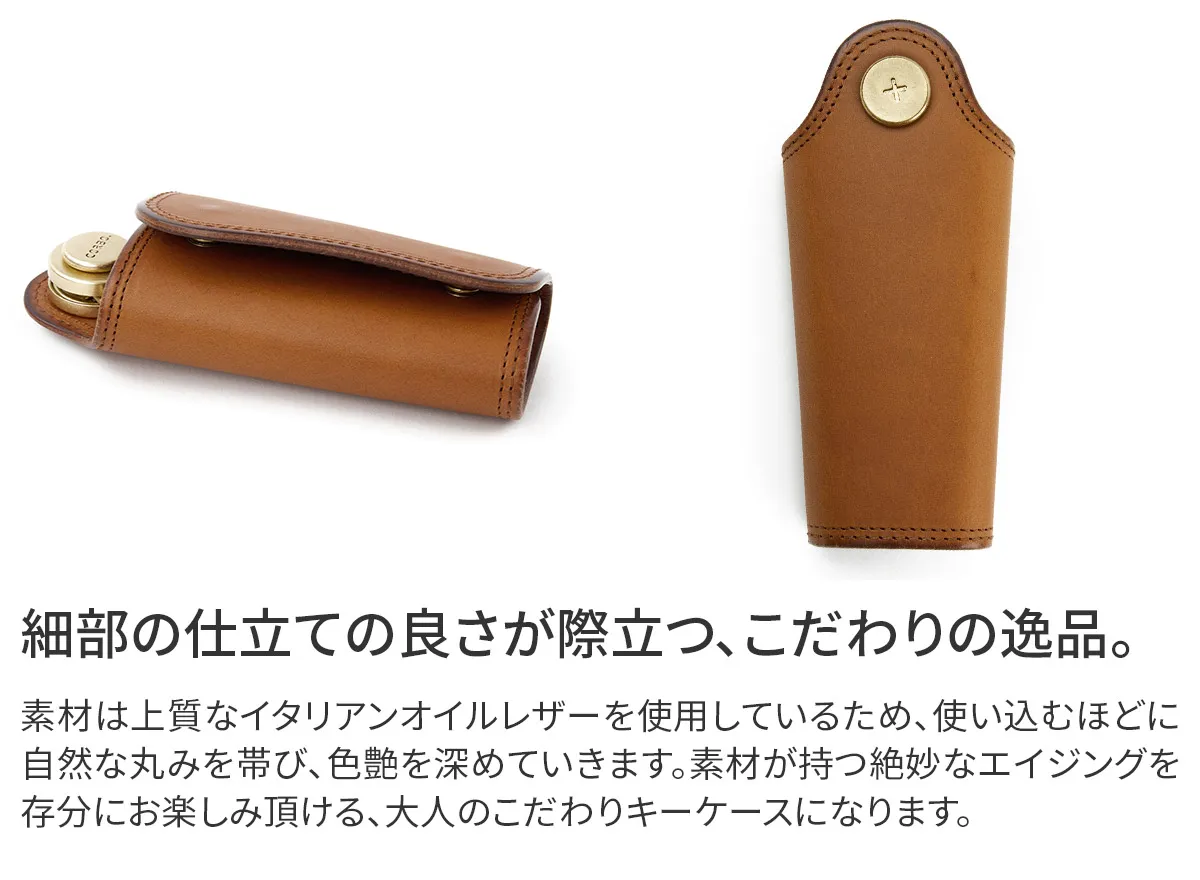 毎日使うもの、大切な鍵だからこそ、上質な革で包みたい。シンプルな流れるようなフォルムに、フラップを開けば6連タイプの回転式キーホルダー金具が他にはない存在感。素材の良さに加えて、ピッチの異なるダブルステッチ、コバの磨きの美しさなど、細部にまで職人の技が凝縮されています。 SLATEの皮革は使い始めてすぐに実感できるほど艶が出やすく、色も深みも増していきます。ホックのアタリなどまで計算されたデザインで、エイジングを愉しめる革の代表格とも言えるでしょう。また、エイジング後を考慮してステッチの色を濃くしたりと、使ってからの配慮が施されています。まさに、使用していく中で完成してゆく逸品です。