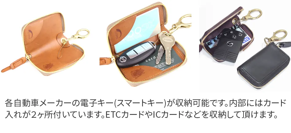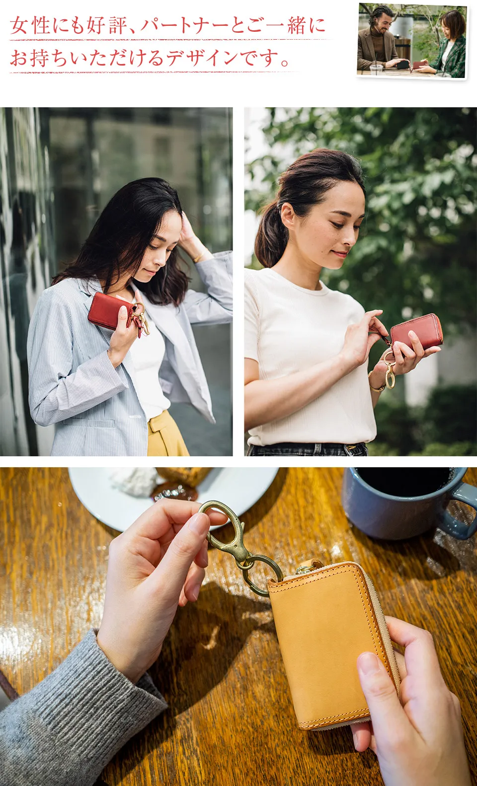 車の電子キー(スマートキー)を収納可能で、カード収納部と併せて使用することで、日常をよりスマートに彩ります。シンプルなデザインだからこそ、SLATEシリーズのイタリアンレザーの質感や、細部の仕立ての良さが光る逸品です。ファスナー式で中身を大切に保護できるのも嬉しいポイント。 SLATEは使い始めてすぐに実感できるほど艶が出やすく、色も深みも増していきます。皮革のアタリも出やすく、エイジングを愉しめる革の代表格とも言えるでしょう。また、エイジング後を考慮してステッチの色を濃くしたりと、使ってからの配慮が施されています。まさに、使用していく中で完成してゆく逸品です。