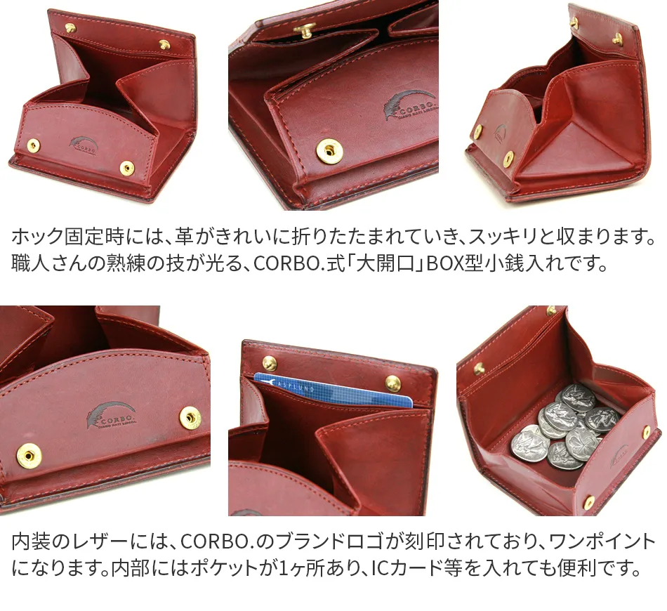 小銭を入れることに追求したシンプルなコインケース。CORBO.式のボックスタイプの小銭入れは大きく開き中身を一望できます。背面にはICカードなどを収納できるオープンポケットも完備しており定期ケースとしても活躍します。 SLATEは使い始めてすぐに実感できるほど艶が出やすく、色も深みも増していきます。エイジング後を考慮してステッチの色を濃くしたりと、使ってからの配慮が施されています。まさに、使用していく中で完成してゆく逸品です。