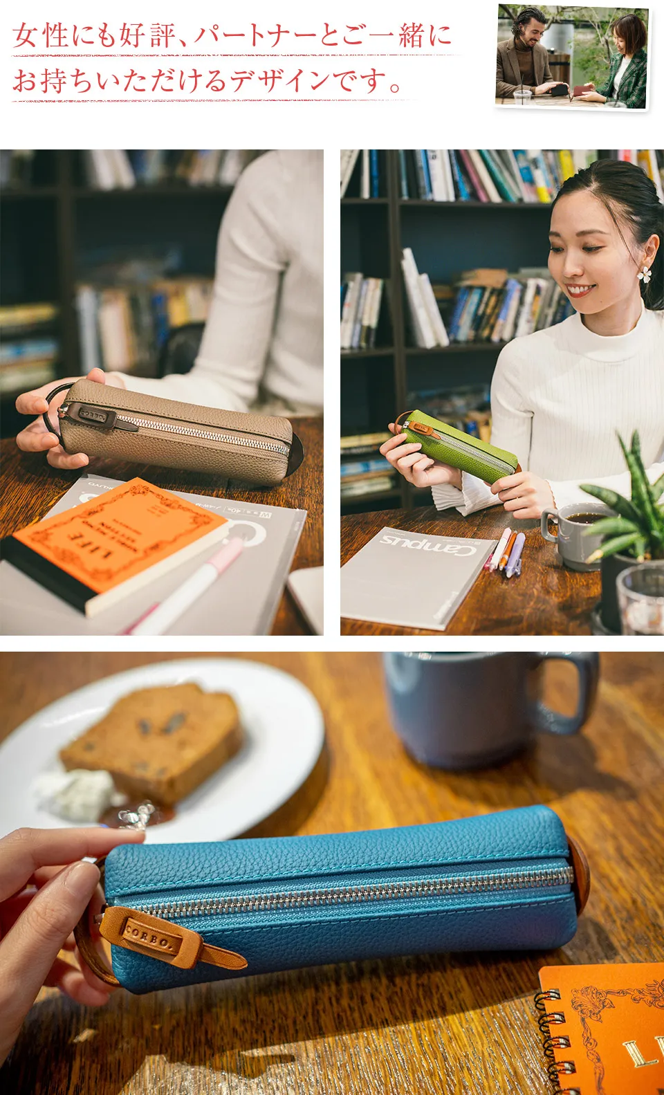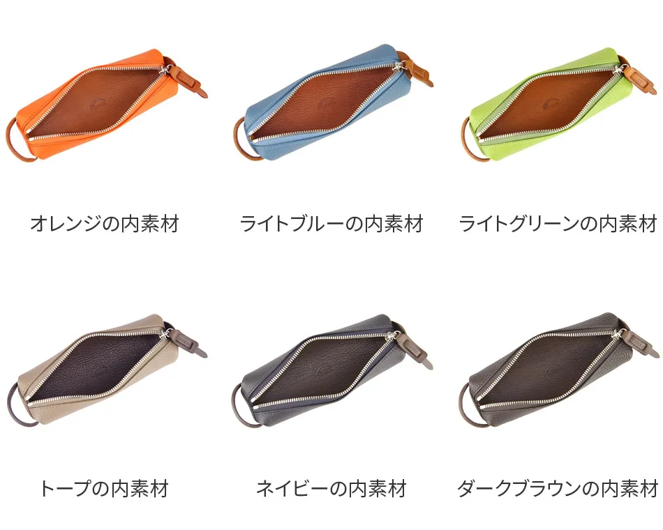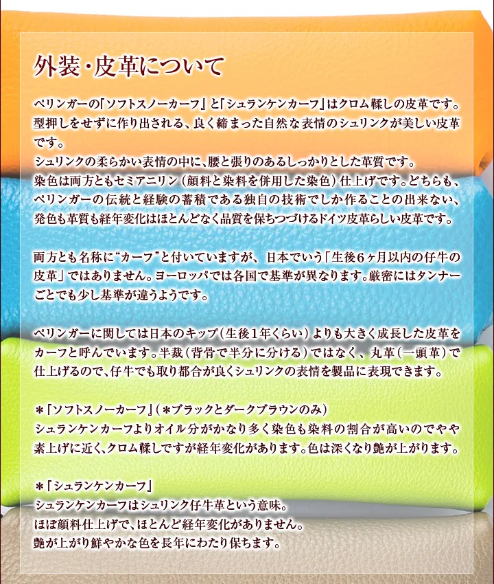 外装にはそれぞれの色味を活かした皮革が使用されています。 オレンジ、ライトブルー、ライトグリーン、トープ、ネイビーには鮮やかな発色を長い間保ち続けるシュランケンカーフを、ダークブラウン、ブラックには使い込む程に色が深まり光沢を帯びるソフトスノーカーフを使用しています。 さらに内装にはイタリア バダラッシ・カルロ社のミネルバボックス、外装の一部には同じくバダラッシ・カルロ社のミネルバリスシオを使用しており何とも贅沢な仕様となっております。 女性も目を引くようなスタイリッシュなフォルムと、シュランケンカーフやソフトスノーカーフが持つ上品さや高級感が相まった、男女問わずお選びいただきやすい魅力的な雰囲気に仕上がっております。