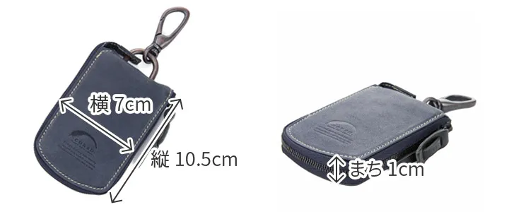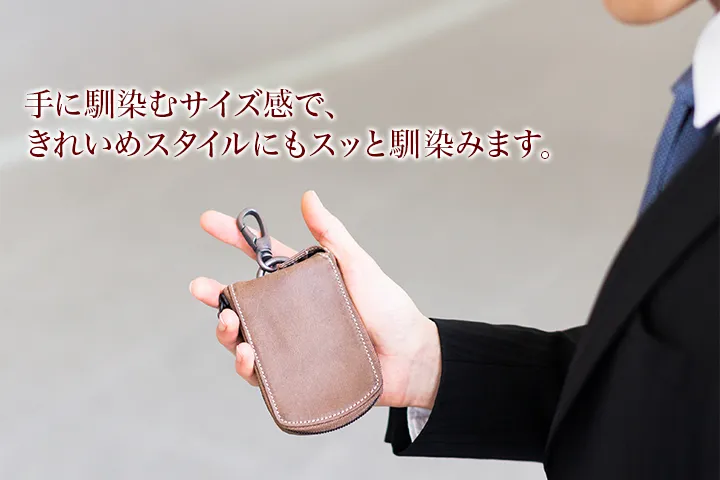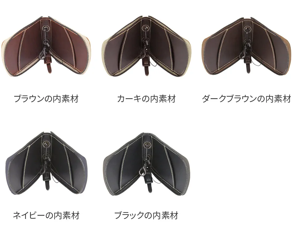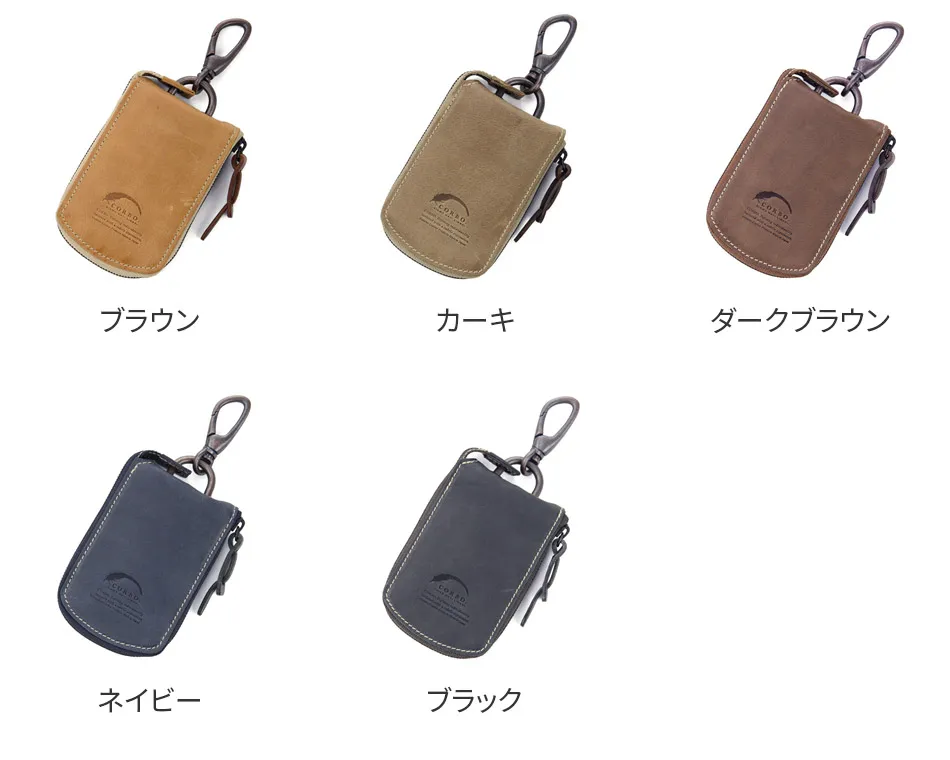 車のスマートキーの収納も可能なキーケースです。カード収納部が2箇所あり、免許証やETCカードを合わせて携帯するのに大変便利です。一般的な鍵は、着脱しやすいナスカン式のキーホルダーに接続可能です。キーケースはラウンドファスナー式で、大切な鍵等をしっかりと守ってくれます。ベルトループ等に接続できるナスカン金具がキーケース本体に取り付けられています。 本体の皮革は、銀面を軽く擦り、染色とほどよいオイル加工で牛革の色や腰を ソフトに落ち着かせ、摩擦による焦がしの効果が出やすいワックス加工を施しています。素朴な雰囲気の皮革に合わせ綿糸風のスパン糸で縫製することで、デニムジーンズの糸への色移りのような表情を出しているため、どこか暖かみを感じるような仕上がりも魅力的。