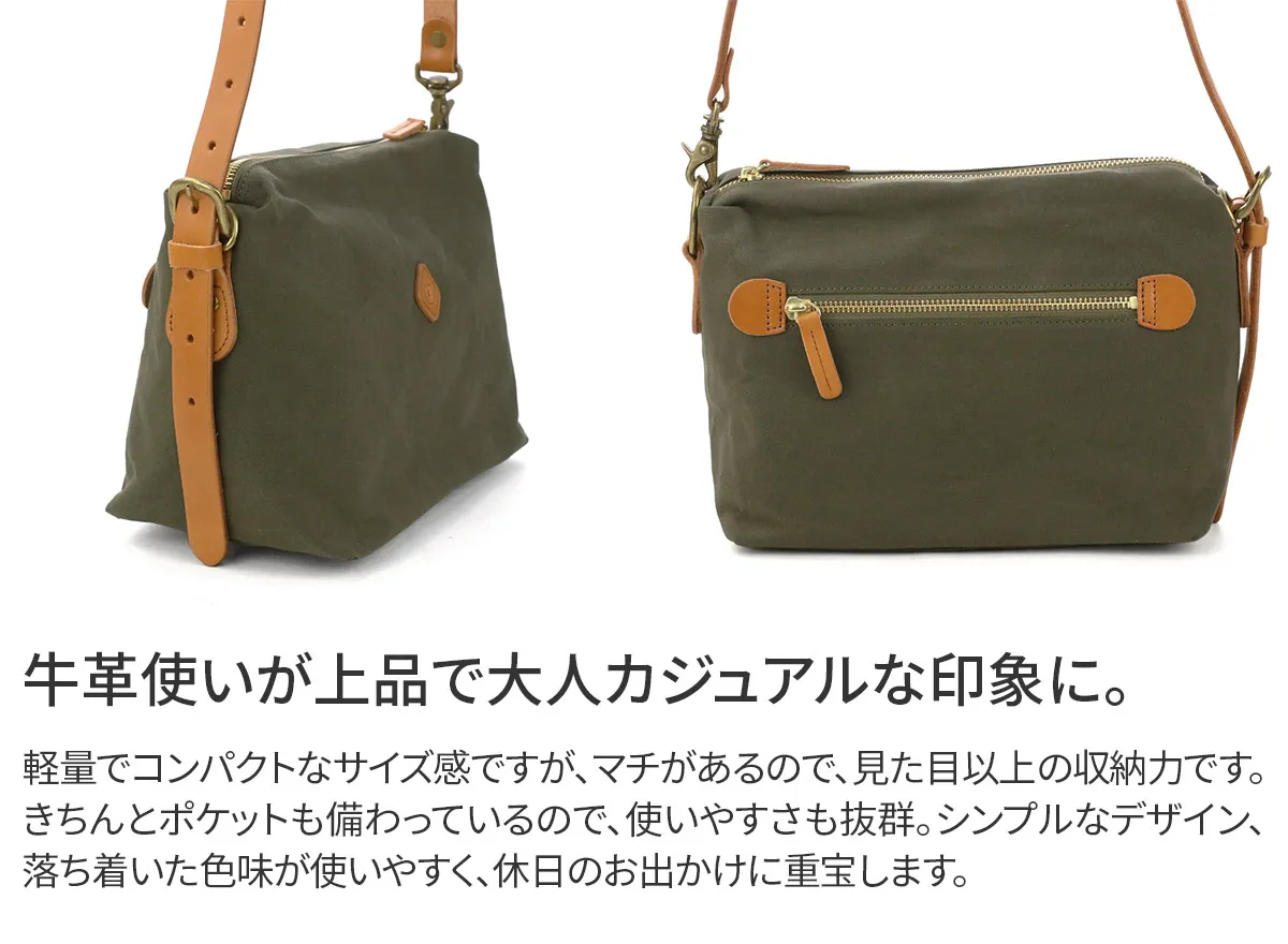 パラフィン加工されハリ感があるキャンバス生地×レザーの大人カジュアルデザイン。軽量で気軽にお持ちいただけます。 コンパクトながら、長財布やスマホ、文庫本などお出かけに必要な荷物をすっぽり収納します。ポケットも備わり小物を整理することも可能。 ショルダーベルトを折り返し、2重に取り付けるとハンドバッグとしてもお使いいただけます。 休日のお出かけや旅行のお供などアクティブに動きたい日におすすめです。