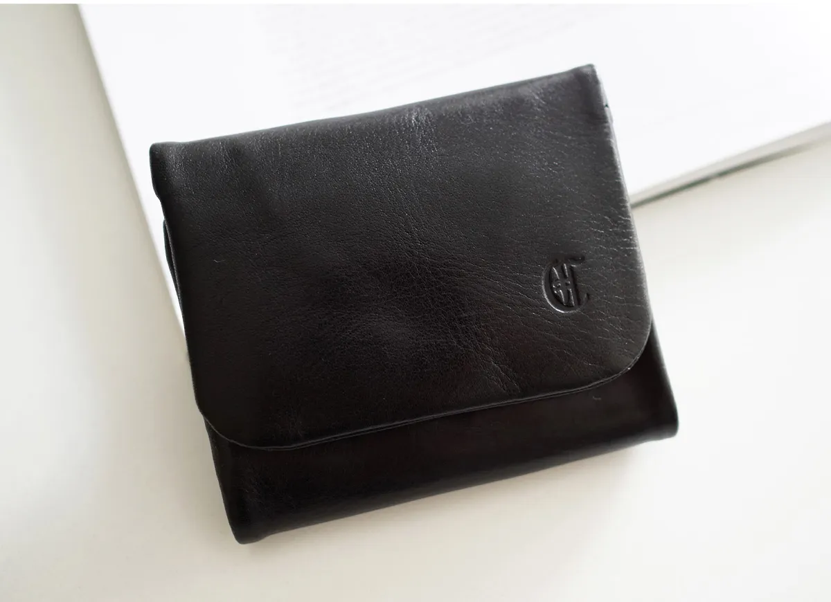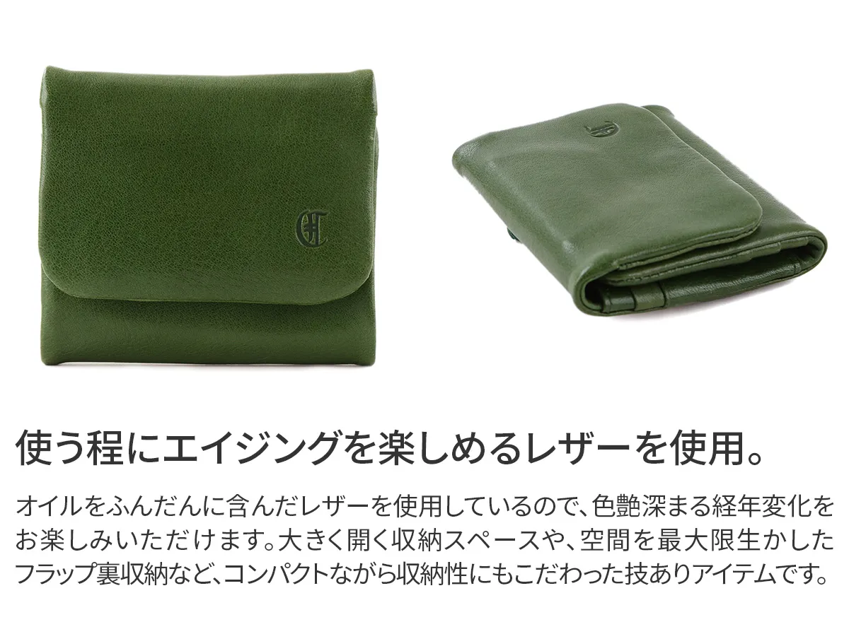 一見シンプルな三つ折り財布ですが、裏返すと外付けのコインケースが佇んでいます。あえて丸みを帯びたデザインがアクセントになり、見た目にも楽しませてくれるアイテムです。オイルをふんだんに含んだ牛革を使用しており、しっとりとした質感が優しく手に馴染みます。
