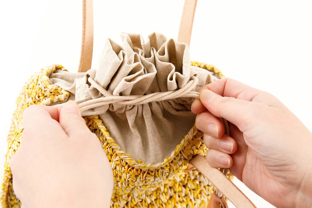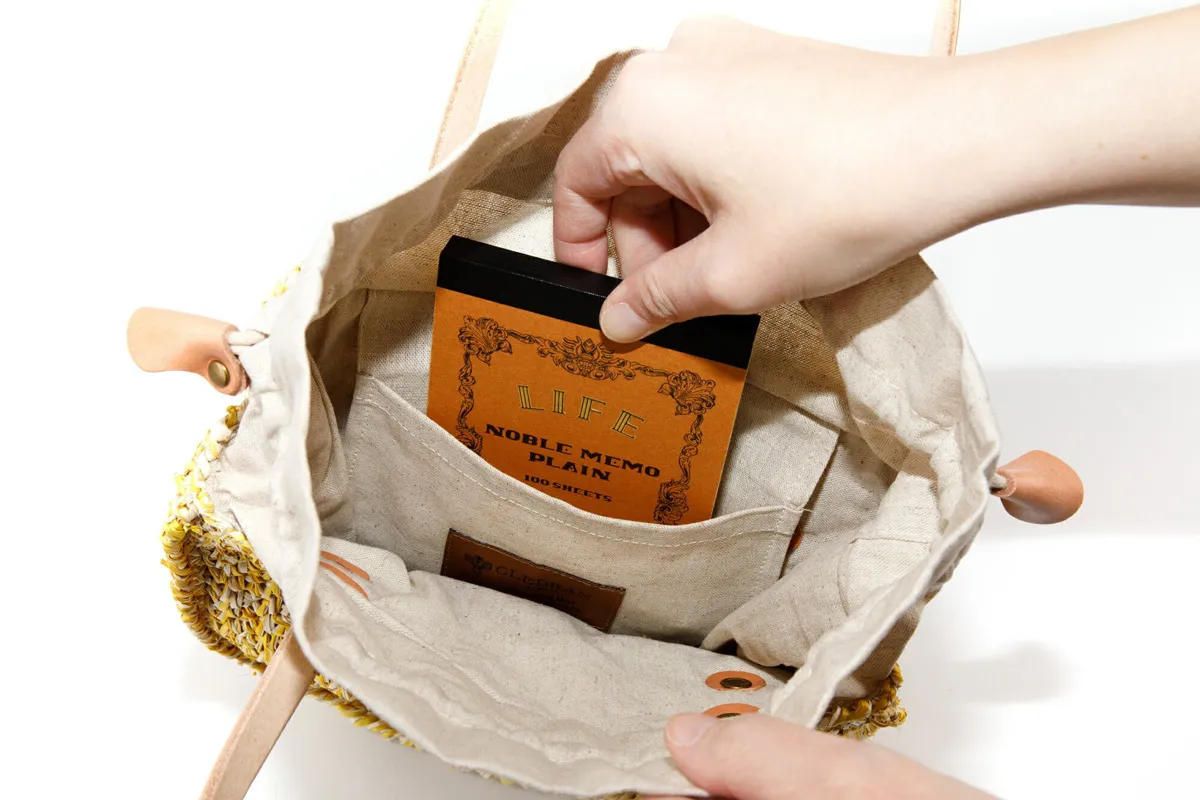 手編みの風合いと、独自の柔らかな質感が魅力のアイテムです。 柔らかなカラーリングに、持ち手のレザーがデザインのアクセントになっています。 メイン開口部は巾着式になっており、防犯面も安心してお持ちいただけます。