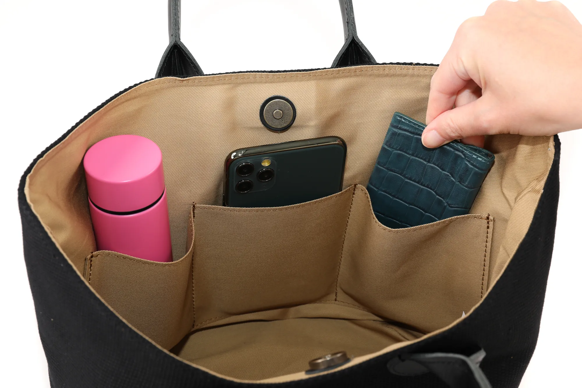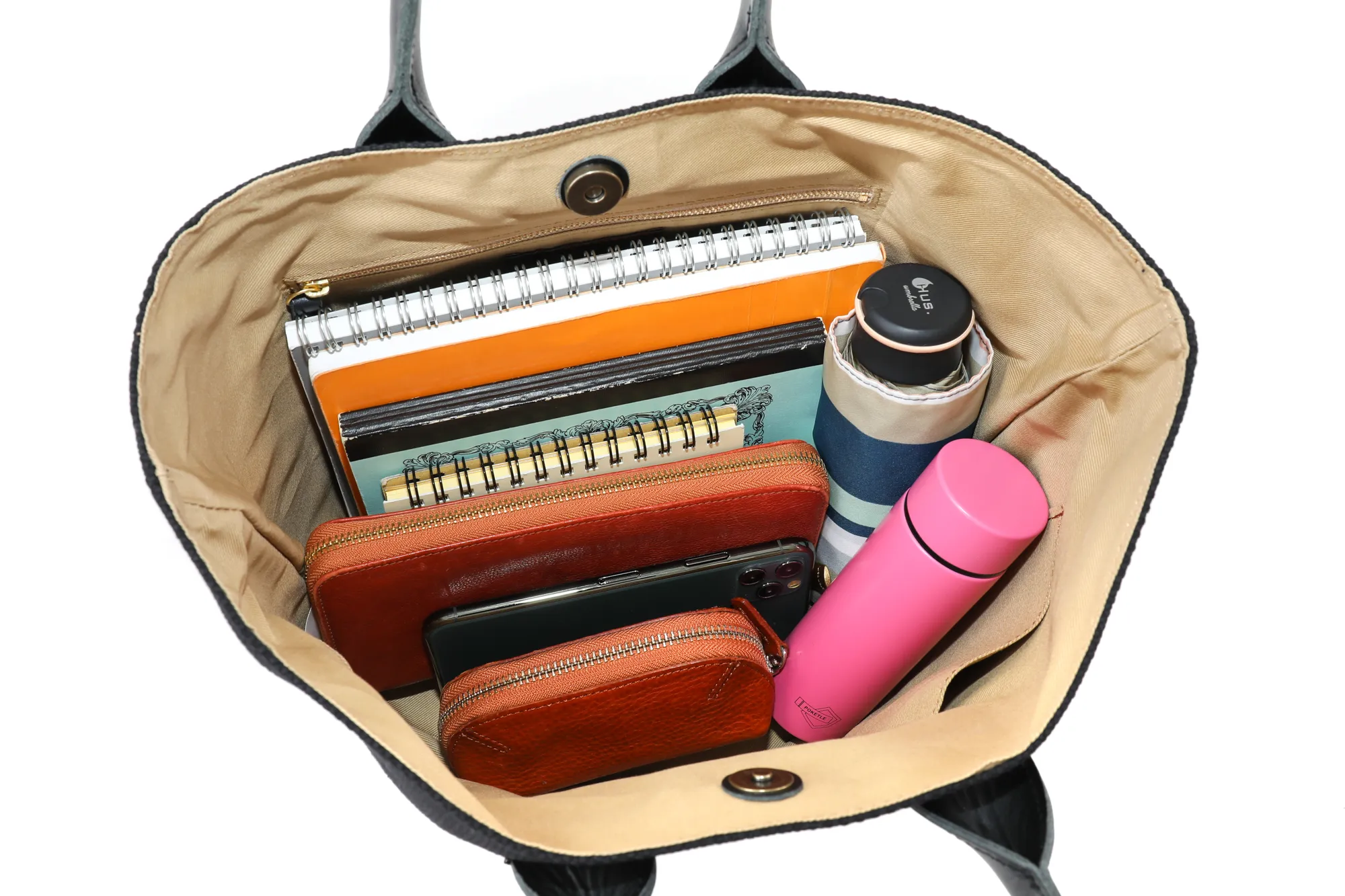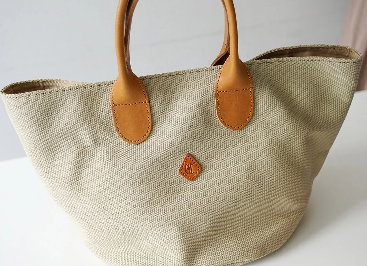 コットン生地に、持ち手のレザーがデザインのアクセントになっています。 カジュアル過ぎず、普段のコーディネートに優しく馴染みます。 しっかりとした生地感で頼もしさもありつつ、さっとお持ち歩きいただける軽やかさも兼ね備えています。