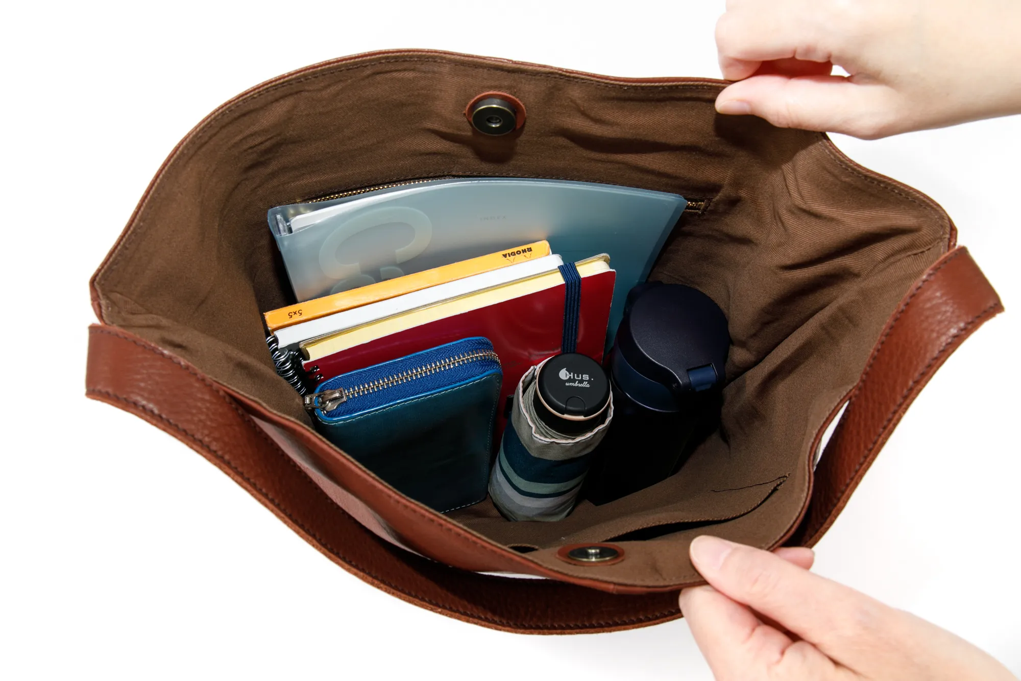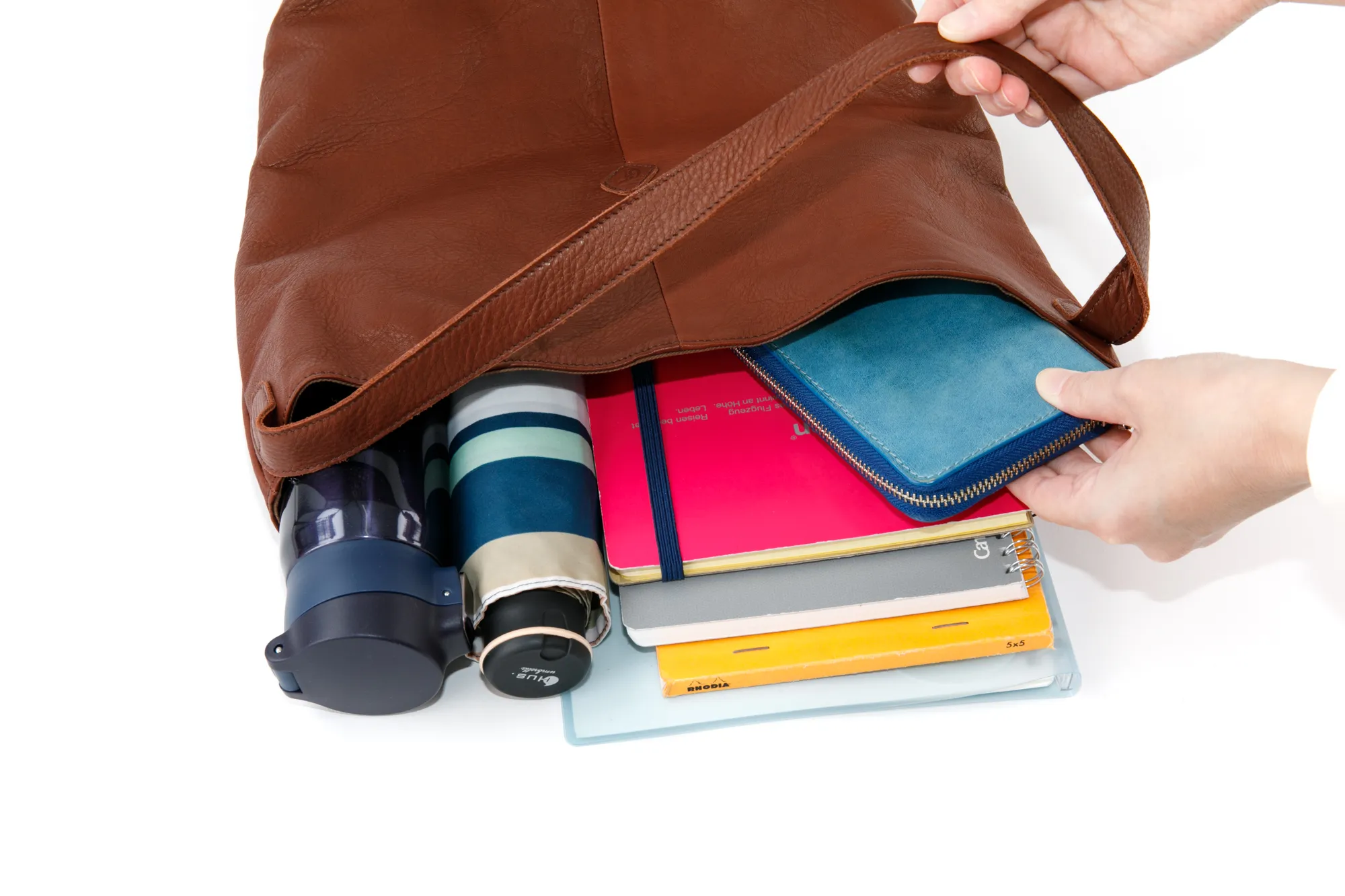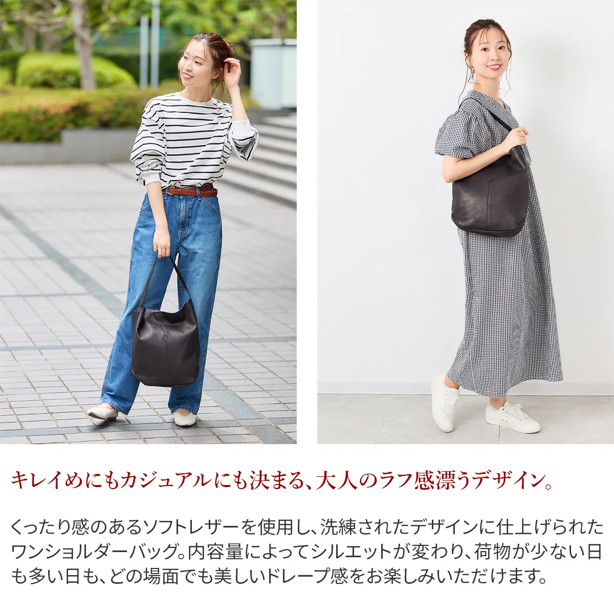 くたっとした可愛いシルエットが目を惹くワンショルダーバッグです。 オイルをたっぷり含んだレザーを贅沢に使用し、1点1点異なる風合いをお楽しみいただけます。 A4書類が縦向きに収まるサイズ感で、お仕事シーンにも活躍してくれるアイテムです。 オールレザーでありながら軽量なので、普段使いしやすいところも嬉しいポイントです。