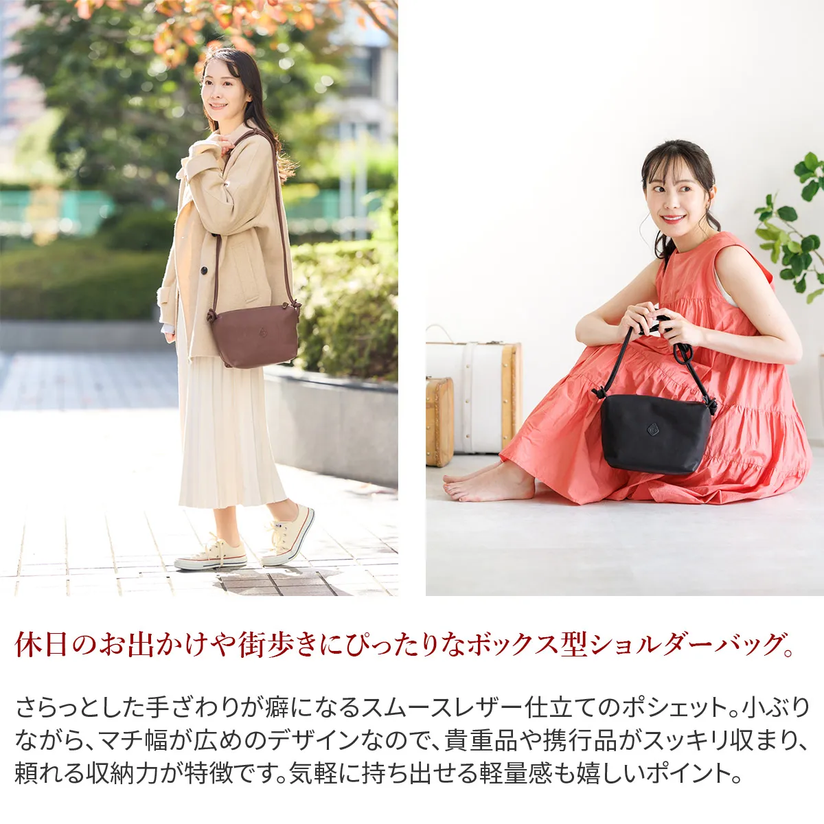 手に馴染むソフトな質感と、端正なスクエアフォルムが目を惹くショルダーバッグです。 奥行きが広めに仕立てているので、コンパクトでありながら収納力の高さが特徴。 内側には2ヶ所、外側の背面には1ヶ所のオープンポケット付きで、中身を細かく分類することも可能です。 装いやシーンを選ばないシックなデザイン性も魅力のひとつです。
