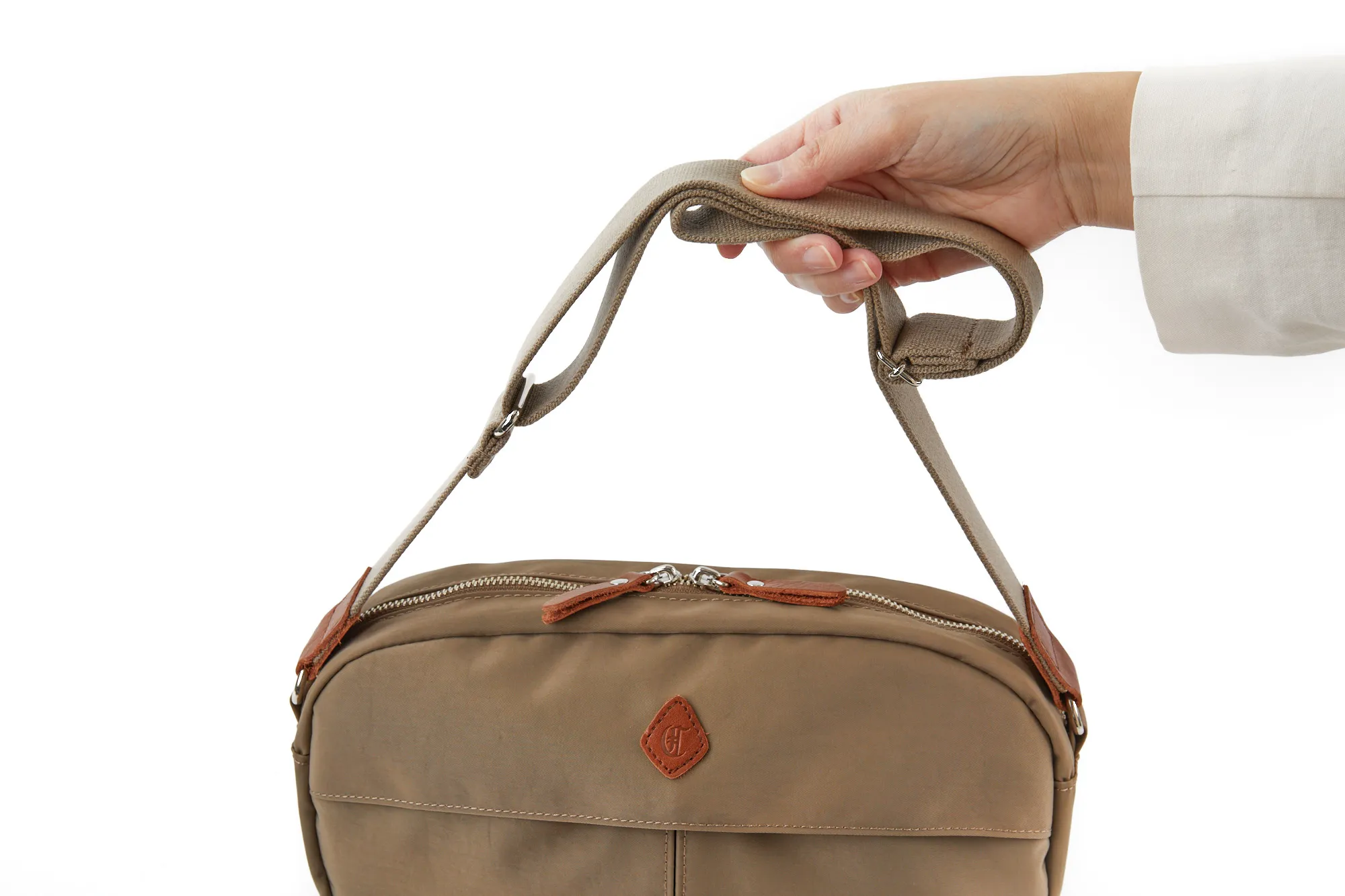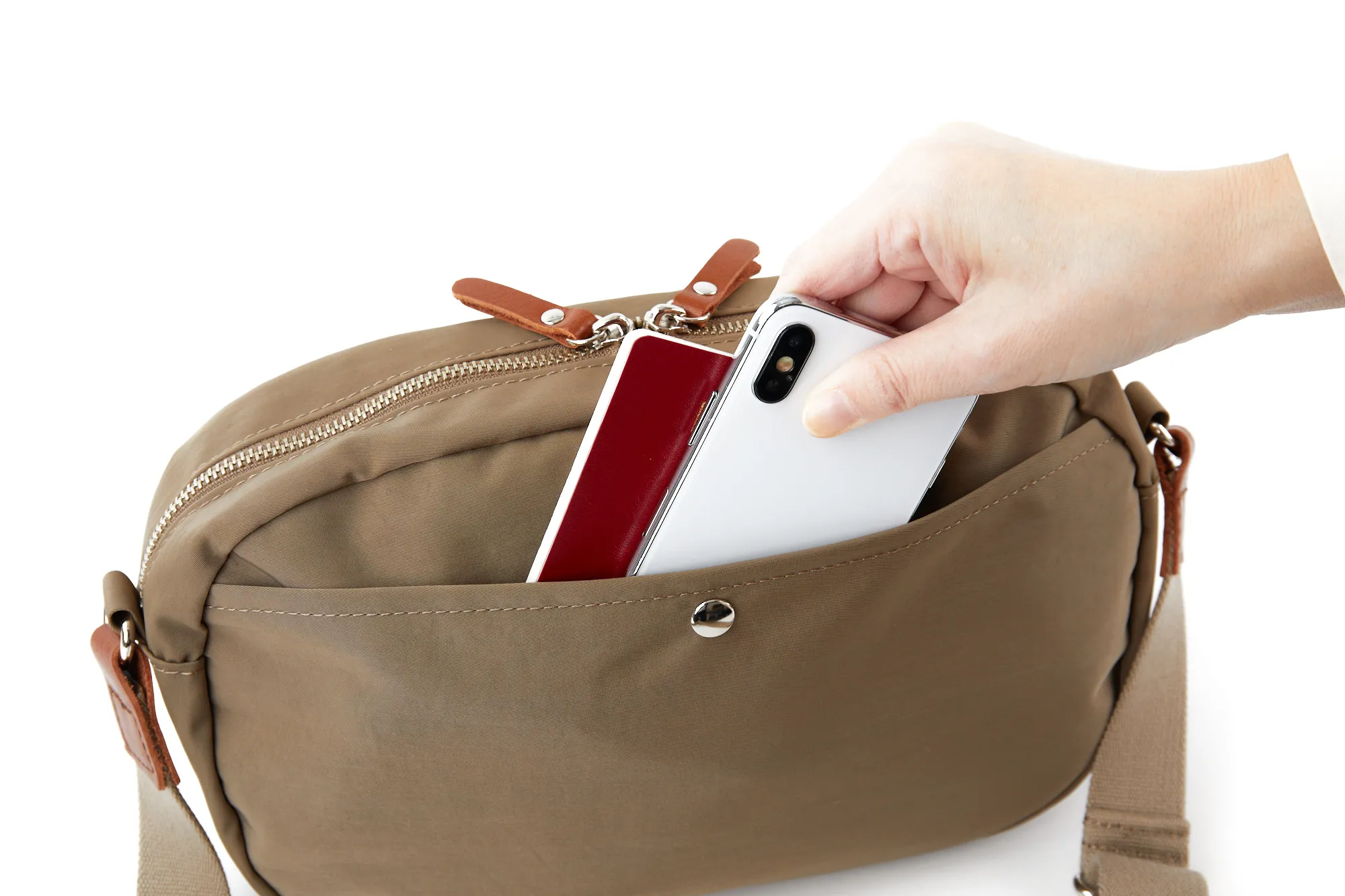 角の無いフォルムが柔らかく体にフィットするショルダーバッグ。使用頻度の高いスマホ等が入れられる大きなポケットが、前後に備えられています。ダブルファスナー仕様の開口部を開けると、内部はマチが約7cmあり、A5サイズが収納可能。見た目以上の収納力を誇ります。